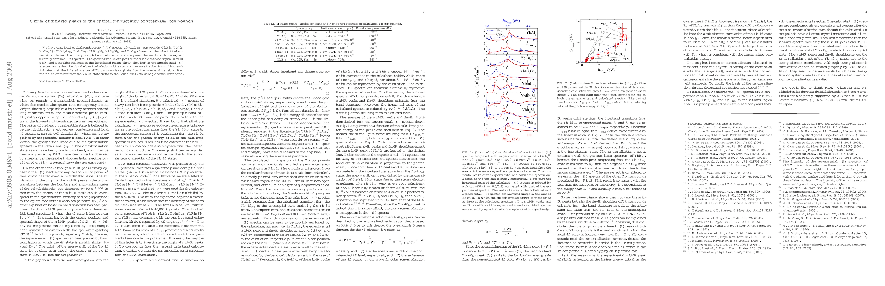 We have calculated optical conductivity [$\sigma(\omega)$] spectra of ytterbium compounds (YbAl$_3$, YbAl$_2$, YbCu$_2$Si$_2$, YbNi$_2$Ge$_2$, YbInCu$_4$, YbRh$_2$Si$_2$, YbIr$_2$Si$_2$, and YbB$_{12}$) based on the direct interband transition derived from first-principle band calculation and compared the results with the experimentally obtained $\sigma(\omega)$ spectra. The spectral feature of a peak in the middle-infrared region (mid-IR peak) and a shoulder structure in the far-infrared region (far-IR shoulder) in the experimental $\sigma(\omega)$ spectra can be described by the band calculation with a common renormalization factor. This result indicates that the infrared spectra of Yb compounds originate from the interband transition from the Yb $4f$ state but that the Yb $4f$ state shifts to the Fermi level with strong electron correlation.
