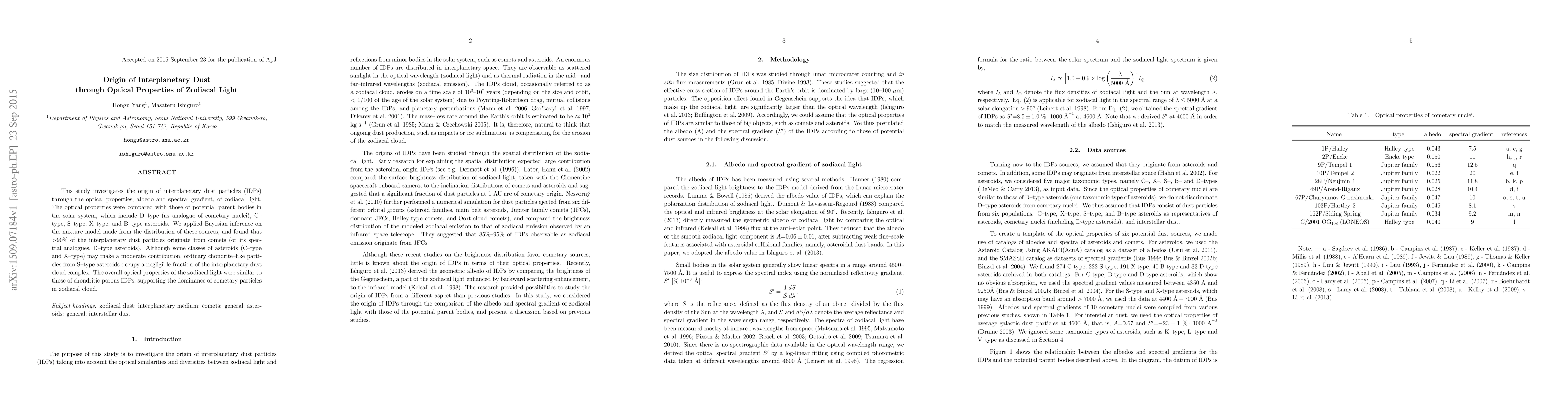 This study investigates the origin of interplanetary dust particles (IDPs) through the optical properties, albedo and spectral gradient, of zodiacal light. The optical properties were compared with those of potential parent bodies in the solar system, which include D-type (as analogue of cometary nuclei), C-type, S-type, X-type, and B-type asteroids. We applied Bayesian inference on the mixture model made from the distribution of these sources, and found that >90% of the interplanetary dust particles originate from comets (or its spectral analogues, D-type asteroids). Although some classes of asteroids (C-type and X-type) may make a moderate contribution, ordinary chondrite-like particles from S-type asteroids occupy a negligible fraction of the interplanetary dust cloud complex. The overall optical properties of the zodiacal light were similar to those of chondritic porous IDPs, supporting the dominance of cometary particles in zodiacal cloud.