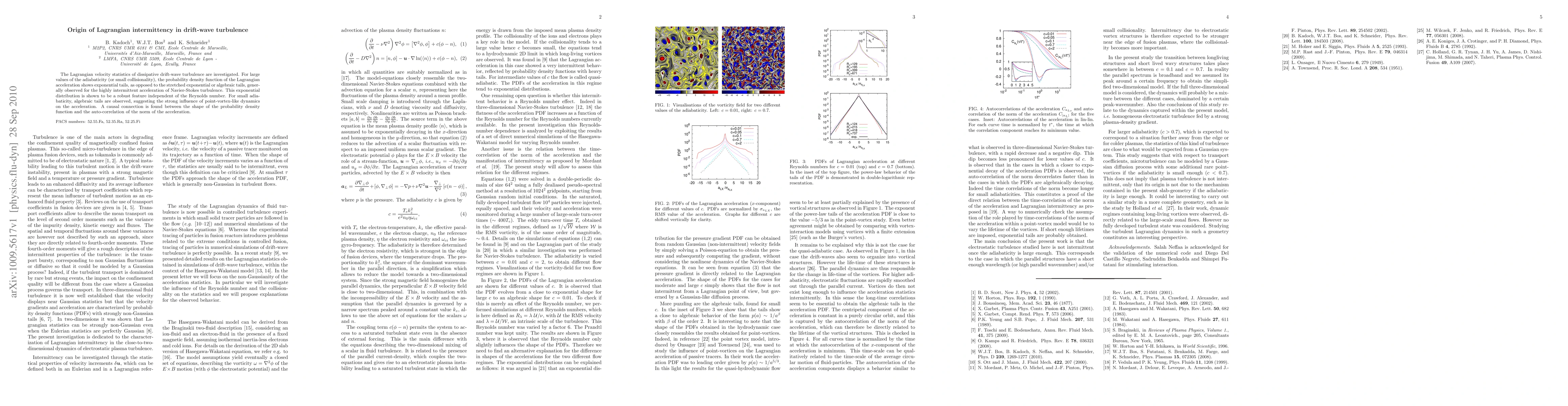 The Lagrangian velocity statistics of dissipative drift-wave turbulence are investigated. For large values of the adiabaticity (or small collisionality), the probability density function of the Lagrangian acceleration shows exponential tails, as opposed to the stretched exponential or algebraic tails, generally observed for the highly intermittent acceleration of Navier-Stokes turbulence. This exponential distribution is shown to be a robust feature independent of the Reynolds number. For small adiabaticity, algebraic tails are observed, suggesting the strong influence of point-vortex-like dynamics on the acceleration. A causal connection is found between the shape of the probability density function and the autocorrelation of the norm of the acceleration.