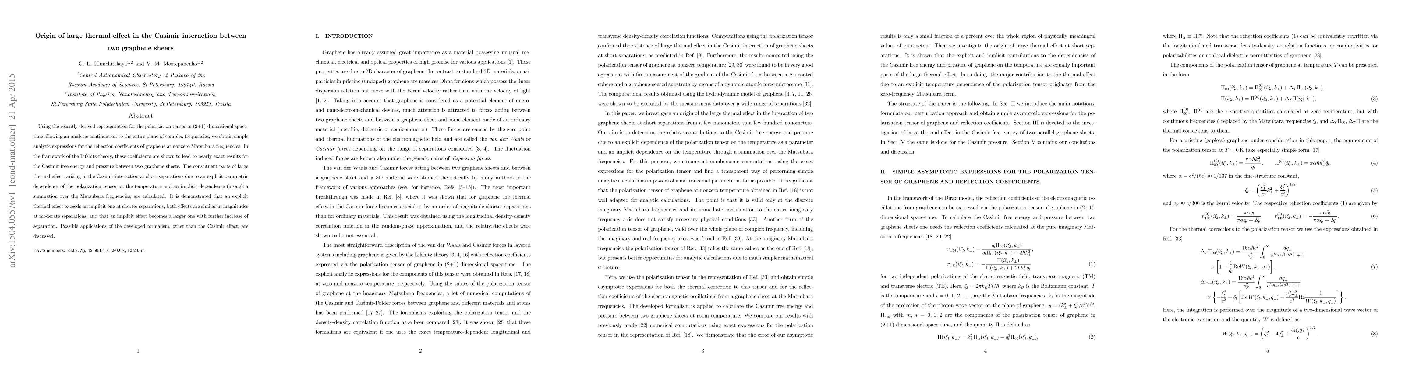 This paper derives analytic expressions for the Casimir free energy and pressure between two graphene sheets, revealing that the large thermal effect in the Casimir interaction is primarily due to explicit temperature dependence in the polarization tensor. It shows that explicit thermal effects dominate at short separations, while implicit effects become more significant at larger separations.