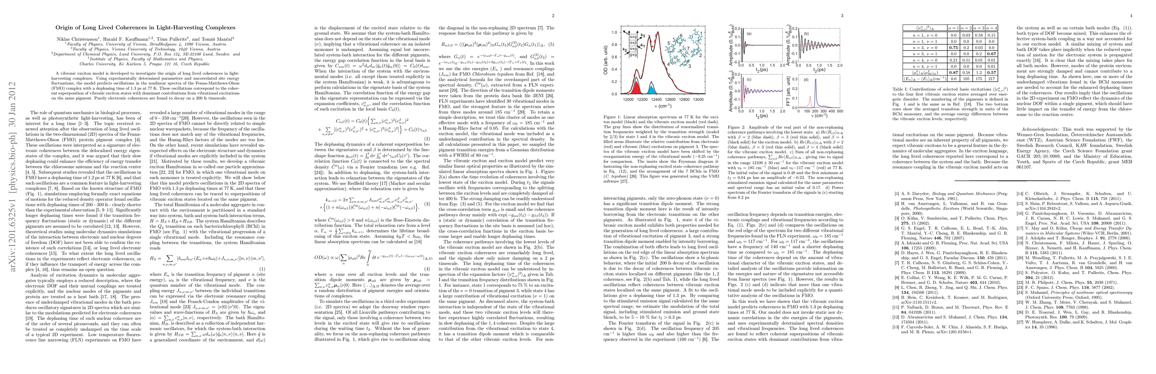 The study develops a vibronic exciton model to explain long-lived coherences in light-harvesting complexes, predicting oscillations in the nonlinear spectra of the FMO complex due to coherent superposition of vibronic exciton states, while purely electronic coherences decay rapidly within 200 fs.