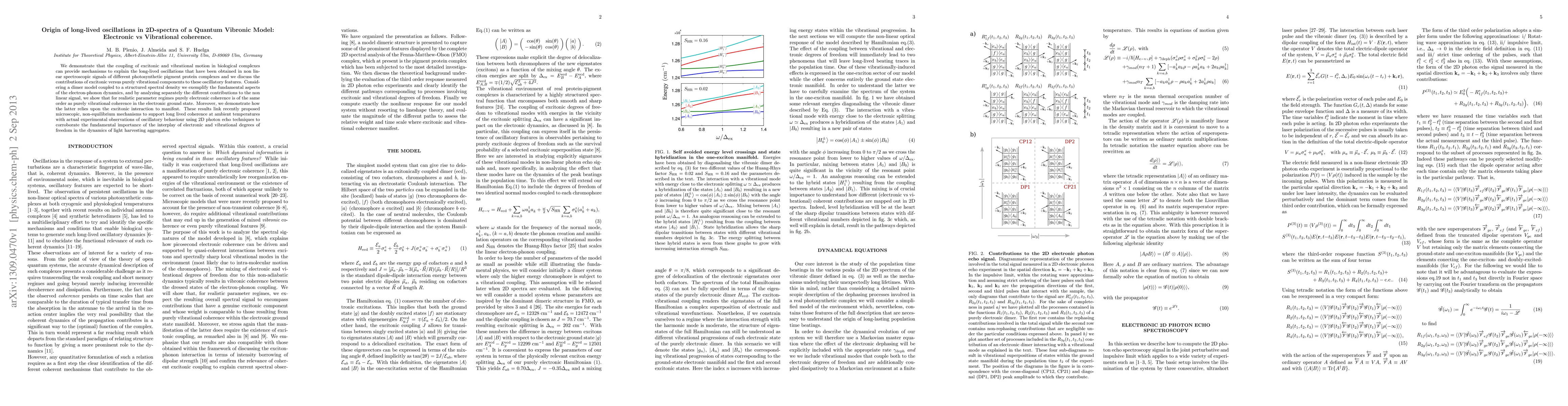 This paper explores the origin of long-lived oscillations in 2D-spectra of a quantum vibronic model, demonstrating that the coupling of excitonic and vibrational motions in biological complexes can explain these oscillations. The study finds that both electronic and vibrational coherences contribute equally to the observed oscillations, highlighting the importance of their interplay in the dynamics of light-harvesting aggregates.