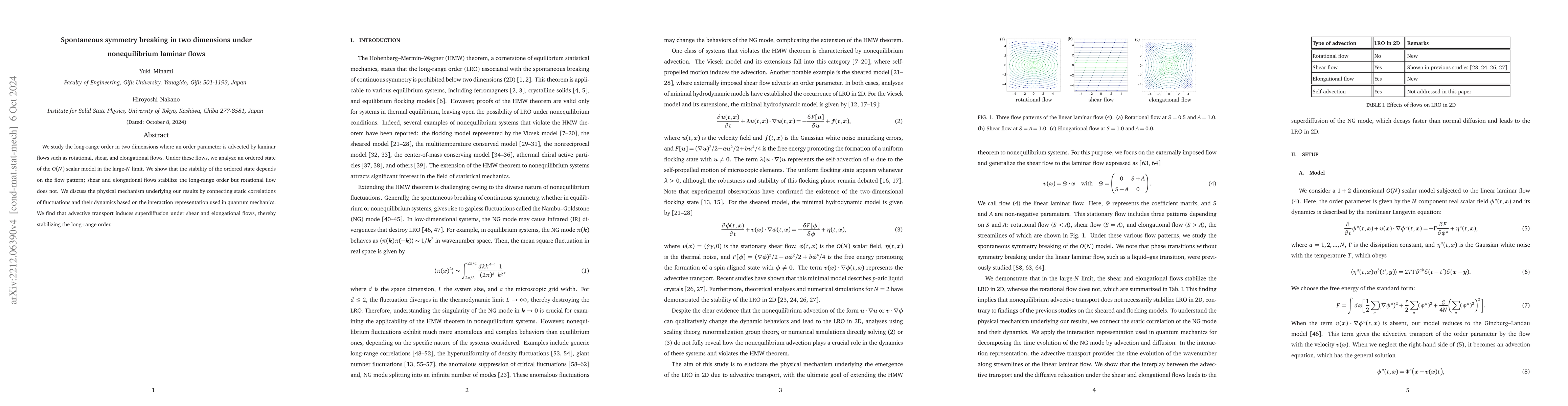 This paper investigates the origin of long-range order in a two-dimensional nonequilibrium system under laminar flows, showing that shear and elongational flows stabilize the ordered state while rotational flows do not. The stability is explained through the advection and stretching effect of wavenumbers along streamlines.