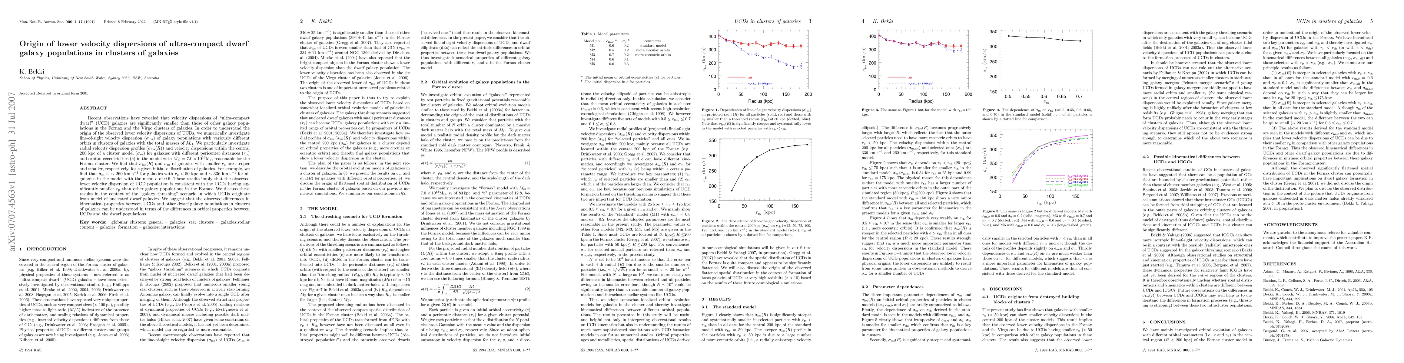 This research investigates the lower velocity dispersions of ultra-compact dwarf (UCD) galaxies in clusters, finding that UCDs with smaller pericenter distances exhibit steeper radial velocity dispersion profiles and lower central velocity dispersions. The study suggests that these differences can be explained by the "galaxy threshing" scenario, where UCDs originate from the nuclei of nucleated dwarf galaxies.