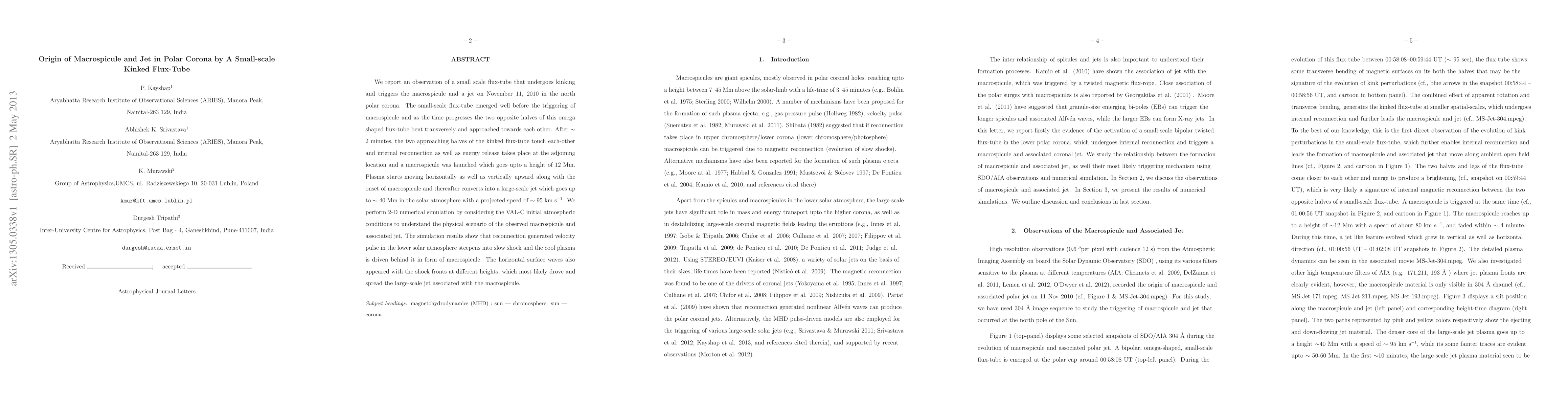 We report an observation of a small scale flux-tube that undergoes kinking and triggers the macrospicule and a jet on November 11, 2010 in the north polar corona. The small-scale flux-tube emerged well before the triggering of macrospicule and as the time progresses the two opposite halves of this omega shaped flux-tube bent transversely and approached towards each other. After $\sim$ 2 minutes, the two approaching halves of the kinked flux-tube touch each-other and internal reconnection as well as energy release takes place at the adjoining location and a macrospicule was launched which goes upto a height of 12 Mm. Plasma starts moving horizontally as well as vertically upward along with the onset of macrospicule and thereafter converts into a large-scale jet which goes up to $\sim$ 40 Mm in the solar atmosphere with a projected speed of $\sim$ 95 km s$^{-1}$. We perform 2-D numerical simulation by considering the VAL-C initial atmospheric conditions to understand the physical scenario of the observed macrospicule and associated jet. The simulation results show that reconnection generated velocity pulse in the lower solar atmosphere steepens into slow shock and the cool plasma is driven behind it in form of macrospicule. The horizontal surface waves also appeared with the shock fronts at different heights, which most likely drove and spread the large-scale jet associated with the macrospicule.