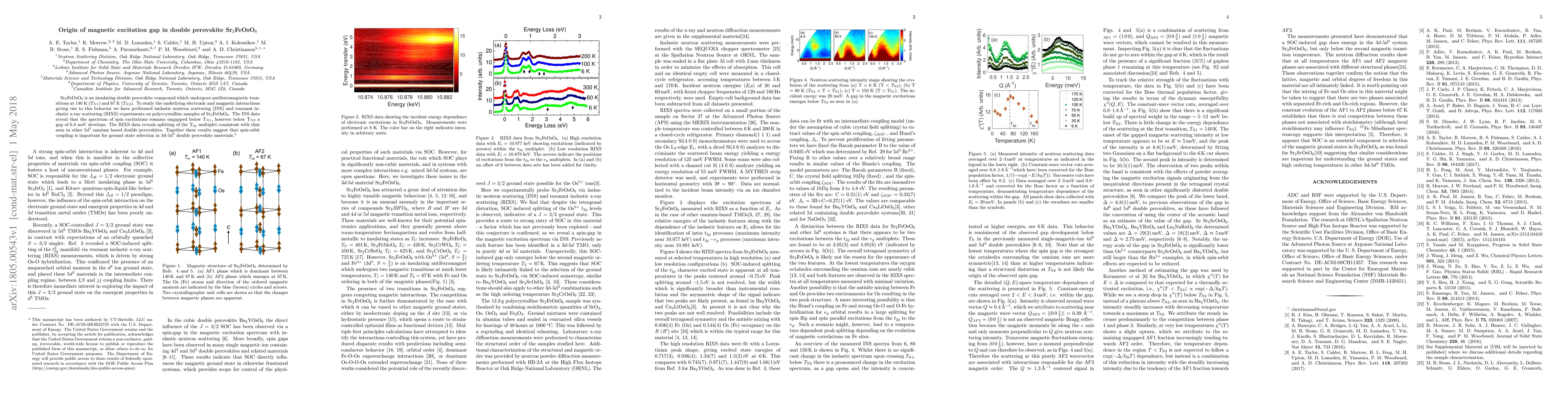 The study of Sr$_2$FeOsO$_6$ reveals that below 67 K, a magnetic excitation gap forms, suggesting spin-orbit coupling's role in the compound's magnetic behavior, as shown by neutron and X-ray scattering experiments. The gap's emergence indicates complex interactions between electronic and magnetic states in this double perovskite.