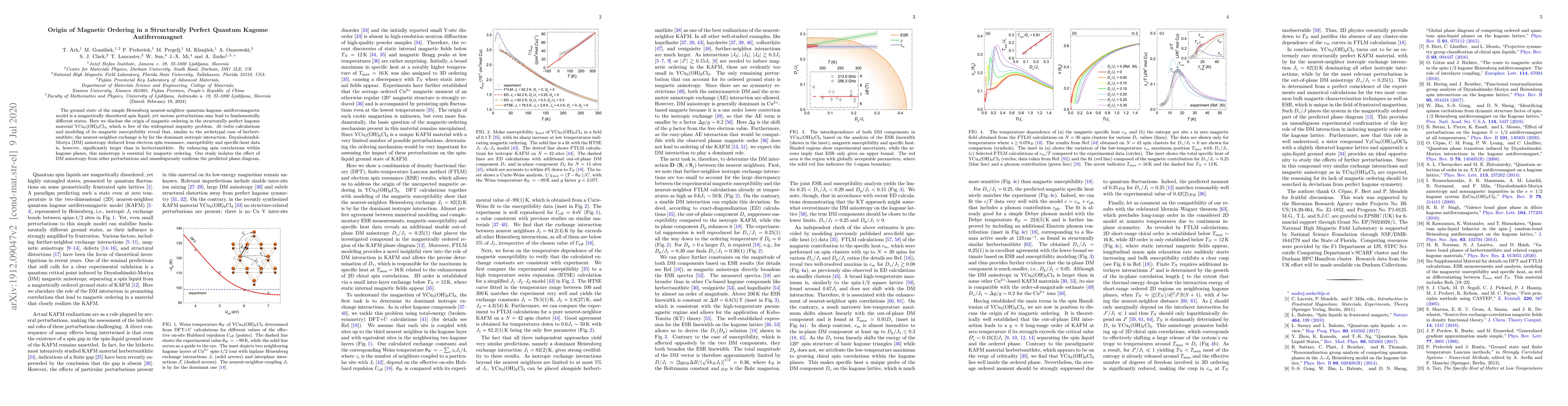 The ground state of the simple Heisenberg nearest-neighbor quantum kagome antiferromagnetic model is a magnetically disordered spin liquid, yet various perturbations may lead to fundamentally different states. Here we disclose the origin of magnetic ordering in the structurally-perfect kagome material YCu$_3$(OH)$_6$Cl$_3$, which is free of the widespread impurity problem. {\it Ab-initio} calculations and modeling of its magnetic susceptibility reveal that, similar to the archetypal case of herbertsmithite, the nearest-neighbor exchange is by far the dominant isotropic interaction. Dzyaloshinskii-Moriya (DM) magnetic anisotropy deduced from electron spin resonance and specific-heat measurements is, however, significantly larger than in herbertsmithite. By enhancing spin correlations within kagome planes, this anisotropy is essential for magnetic ordering. Our study isolates the effect of DM anisotropy from other perturbations and unambiguously confirms the theoretical phase diagram.