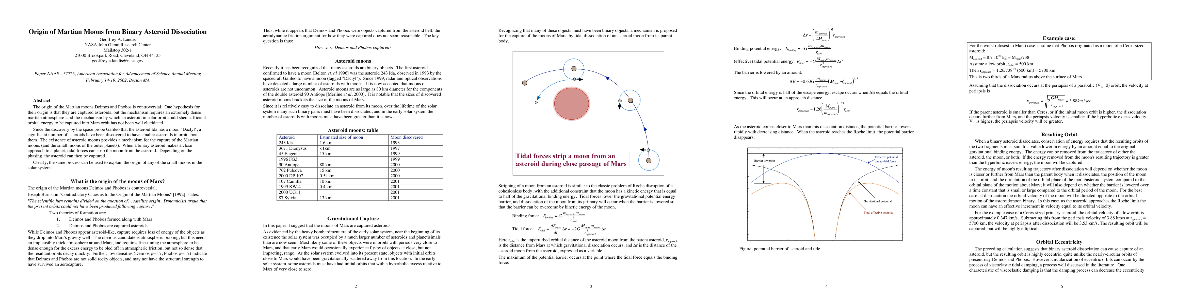 The origin of the Martian moons Deimos and Phobos is controversial. One hypothesis for their origin is that they are captured asteroids, but the mechanism requires an extremely dense martian atmosphere, and the mechanism by which an asteroid in solar orbit could shed sufficient orbital energy to be captured into Mars orbit has not been well elucidated. Since the discovery by the space probe Galileo that the asteroid Ida has a moon "Dactyl", a significant number of asteroids have been discovered to have smaller asteroids in orbit about them. The existence of asteroid moons provides a mechanism for the capture of the Martian moons (and the small moons of the outer planets). When a binary asteroid makes a close approach to a planet, tidal forces can strip the moon from the asteroid. Depending on the phasing, the asteroid can then be captured. Clearly, the same process can be used to explain the origin of any of the small moons in the solar system.