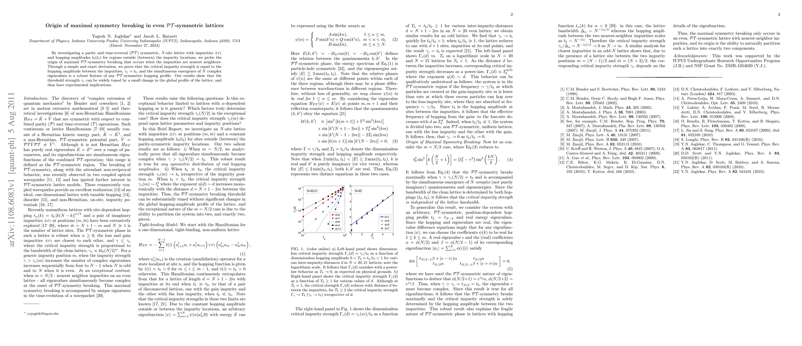 By investigating a parity and time-reversal (PT) symmetric, $N$-site lattice with impurities $\pm i\gamma$ and hopping amplitudes $t_0 (t_b)$ for regions outside (between) the impurity locations, we probe the origin of maximal PT-symmetry breaking that occurs when the impurities are nearest neighbors. Through a simple and exact derivation, we prove that the critical impurity strength is equal to the hopping amplitude between the impurities, $\gamma_c=t_b$, and the simultaneous emergence of $N$ complex eigenvalues is a robust feature of any PT-symmetric hopping profile. Our results show that the threshold strength $\gamma_c$ can be widely tuned by a small change in the global profile of the lattice, and thus have experimental implications.