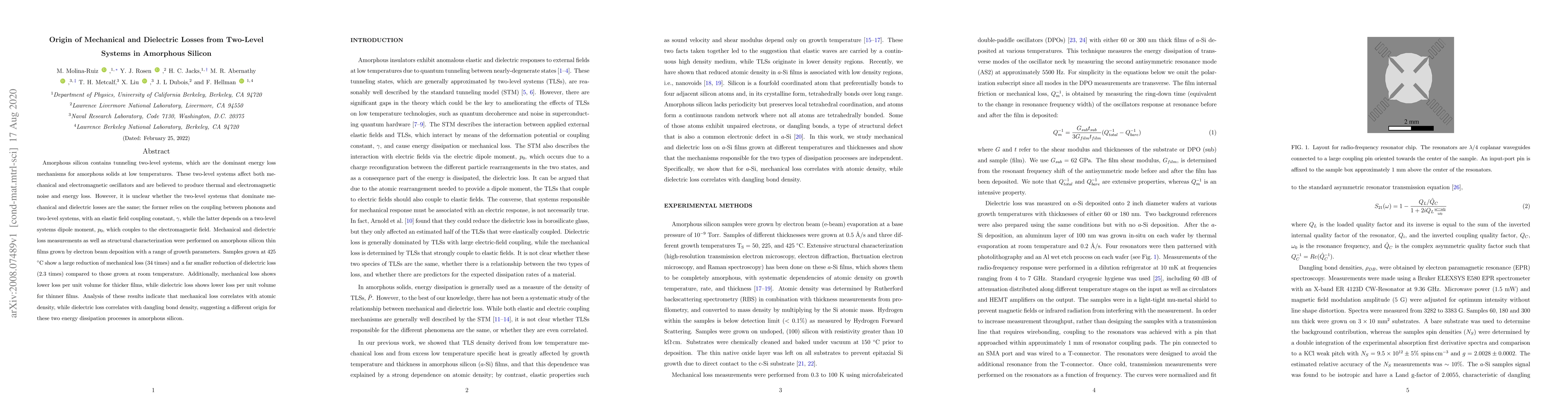 This study investigates the mechanical and dielectric losses in amorphous silicon, attributing them to tunneling two-level systems (TLS). Results show that mechanical loss correlates with atomic density, while dielectric loss correlates with dangling bond density, indicating different origins for these losses.