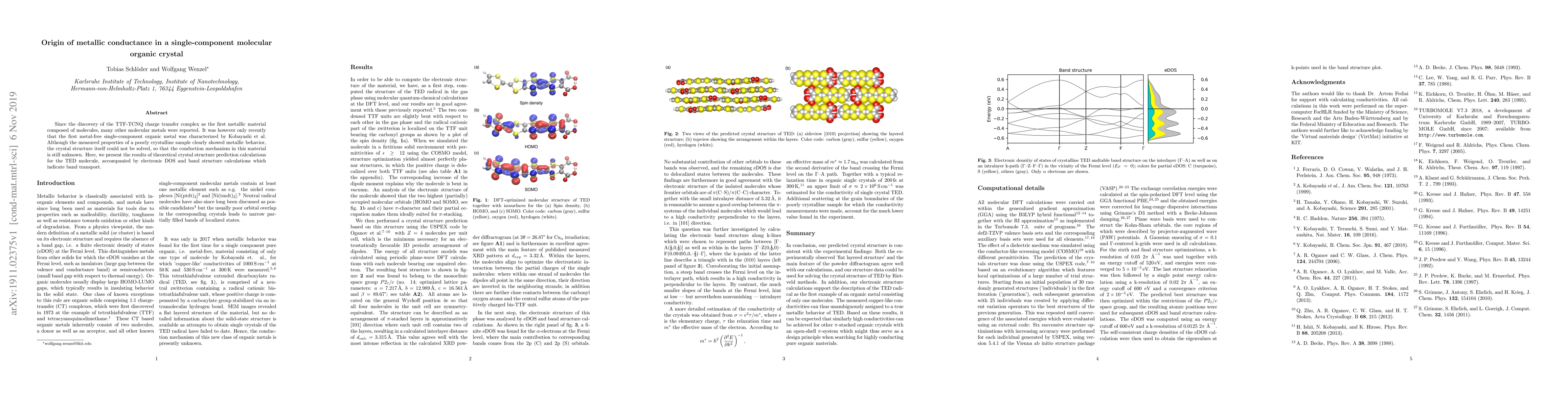 Since the discovery of the TTF-TCNQ charge transfer complex as the first metallic material composed of molecules, many other molecular metals were reported. It was however only recently that the first metal-free single-component organic metal was characterized by Kobayashi et al. Although the measured properties of a poorly crystalline sample clearly showed metallic behavior, the crystal structure itself could not be solved, so that the conduction mechanism in this material is still unknown. Here, we present the results of theoretical crystal structure prediction calculations for the TED molecule, accompanied by electronic DOS and band structure calculations which indicate band transport.