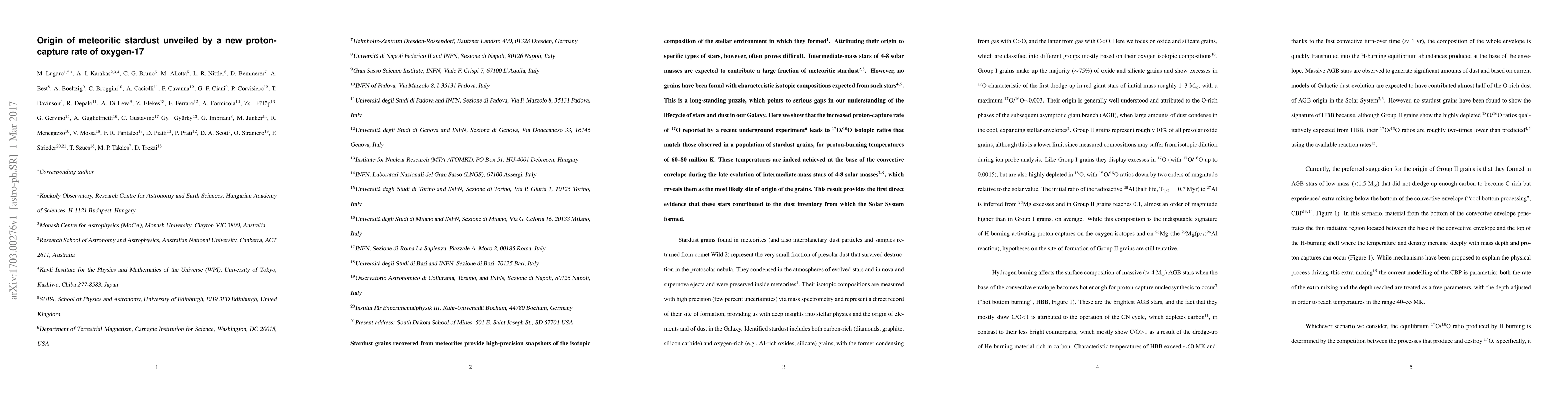 Stardust grains recovered from meteorites provide high-precision snapshots of the isotopic composition of the stellar environment in which they formed. Attributing their origin to specific types of stars, however, often proves difficult. Intermediate-mass stars of 4-8 solar masses are expected to contribute a large fraction of meteoritic stardust. However, no grains have been found with characteristic isotopic compositions expected from such stars. This is a long-standing puzzle, which points to serious gaps in our understanding of the lifecycle of stars and dust in our Galaxy. Here we show that the increased proton-capture rate of $^{17}$O reported by a recent underground experiment leads to $^{17}$O/$^{16}$O isotopic ratios that match those observed in a population of stardust grains, for proton-burning temperatures of 60-80 million K. These temperatures are indeed achieved at the base of the convective envelope during the late evolution of intermediate-mass stars of 4-8 solar masses, which reveals them as the most likely site of origin of the grains. This result provides the first direct evidence that these stars contributed to the dust inventory from which the Solar System formed.