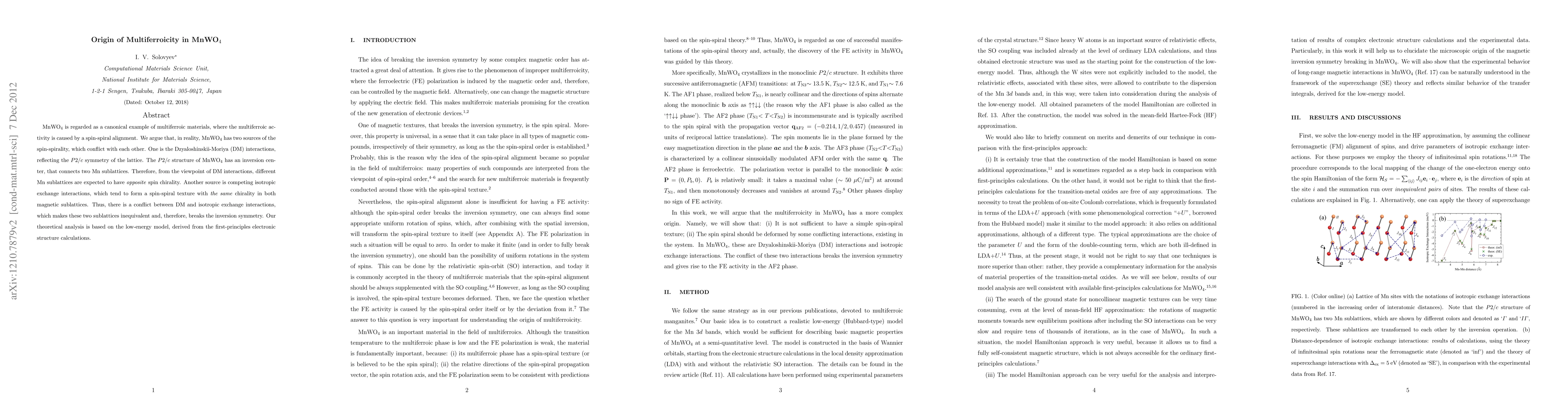 MnWO4 has two sources of spin-spirality that conflict with each other: Dzyaloshinskii-Moriya interactions and competing isotropic exchange interactions. This conflict breaks the inversion symmetry, making the sublattices inequivalent.