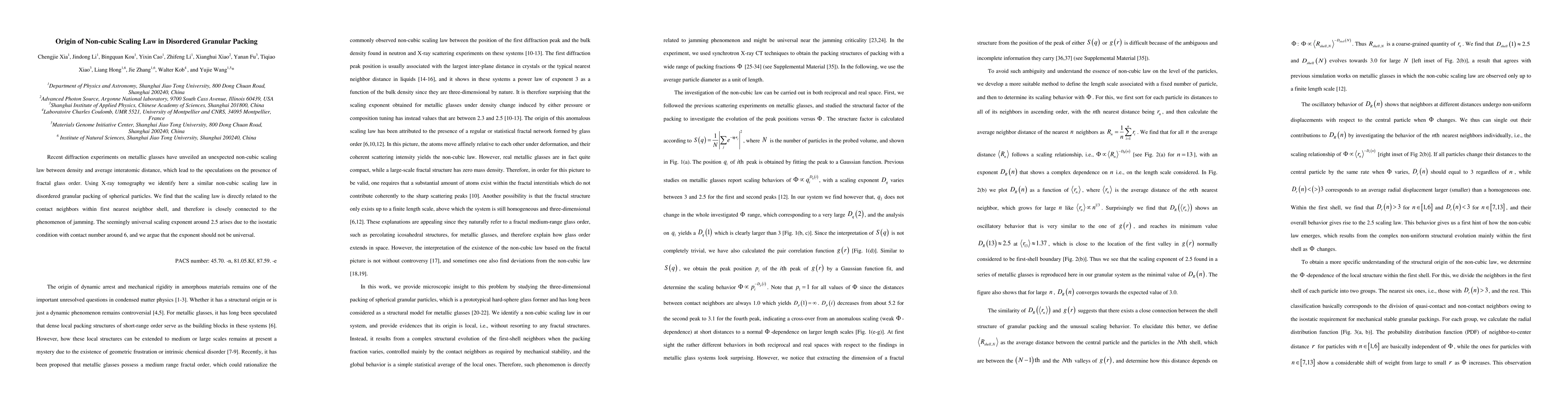 Researchers use X-ray tomography to discover a non-cubic scaling law in disordered granular packing of spherical particles, linked to contact neighbors within the first nearest neighbor shell, and find a universal exponent around 2.5 due to an isostatic condition.