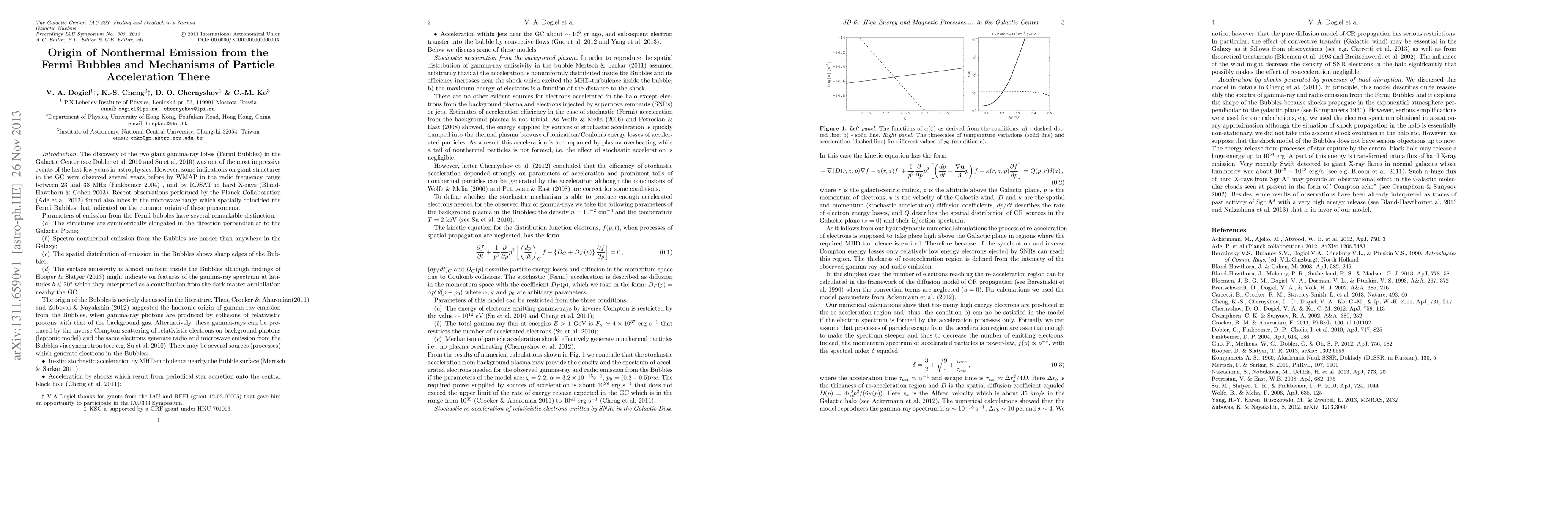 This paper investigates particle acceleration mechanisms in the Fermi Bubbles, focusing on background plasma, re-acceleration of electrons from supernova remnants, and shock acceleration from star tidal disruptions. The analysis favors multi-shock acceleration as the most plausible mechanism.