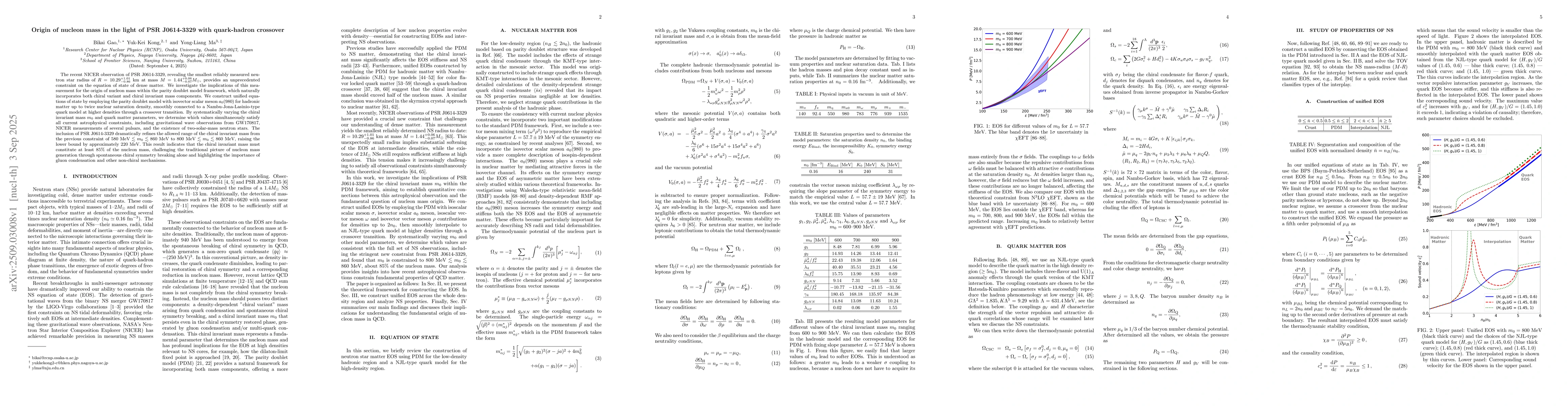The recent NICER observation of PSR J0614-3329, revealing the smallest reliably measured neutron star radius of $R = 10.29^{+1.01}_{-0.86}$ km at mass $M = 1.44^{+0.06}_{-0.07} M_\odot$, provides an unprecedented constraint on the equation of state of dense matter. We investigate the implications of this measurement for the origin of nucleon mass within the parity doublet model framework, which naturally incorporates both chiral variant and chiral invariant mass components. We construct unified equations of state by employing the parity doublet model with isovector scalar meson $a_0(980)$ for hadronic matter up to twice nuclear saturation density, smoothly connected to a Nambu-Jona-Lasinio-type quark model at higher densities through a crossover transition. By systematically varying the chiral invariant mass $m_0$ and quark matter parameters, we determine which values simultaneously satisfy all current astrophysical constraints, including gravitational wave observations from GW170817, NICER measurements of several pulsars, and the existence of two-solar-mass neutron stars. The inclusion of PSR J0614-3329 dramatically refines the allowed range of the chiral invariant mass from the previous constraint of $580~\text{MeV} \lesssim m_0 \lesssim 860~\text{MeV}$ to $800~\text{MeV} \lesssim m_0 \lesssim 860~\text{MeV}$, raising the lower bound by approximately 220 MeV. This result indicates that the chiral invariant mass must constitute at least 85\% of the nucleon mass, challenging the traditional picture of nucleon mass generation through spontaneous chiral symmetry breaking alone and highlighting the importance of gluon condensation and other non-chiral mechanisms.