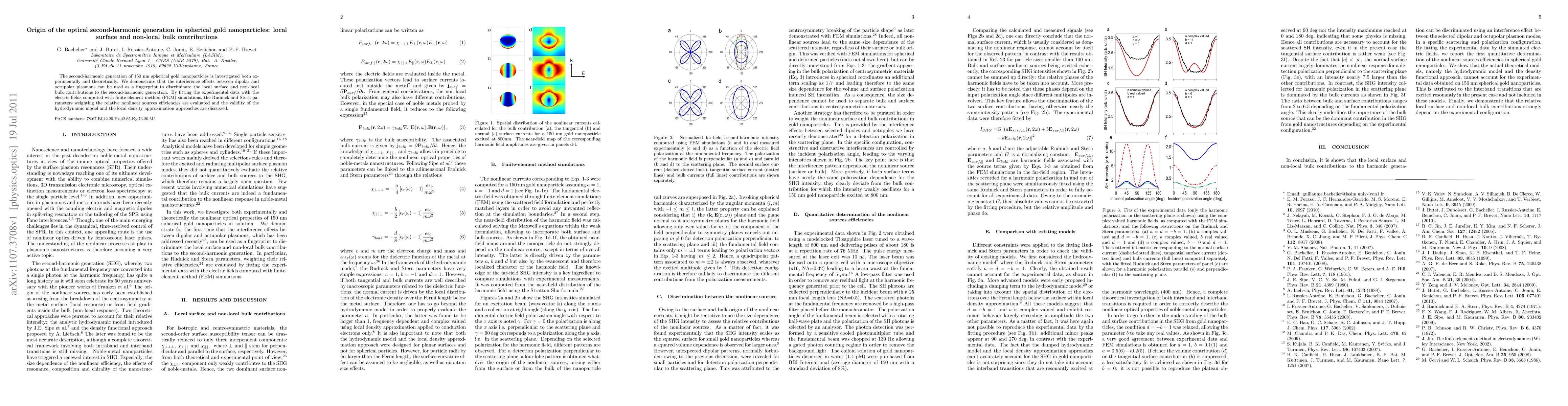 This paper investigates the origin of optical second-harmonic generation in 150 nm spherical gold nanoparticles, identifying both local surface and nonlocal bulk contributions. It uses interference effects between dipolar and octupolar plasmons to distinguish these contributions and evaluates the efficiencies of nonlinear sources using FEM simulations.