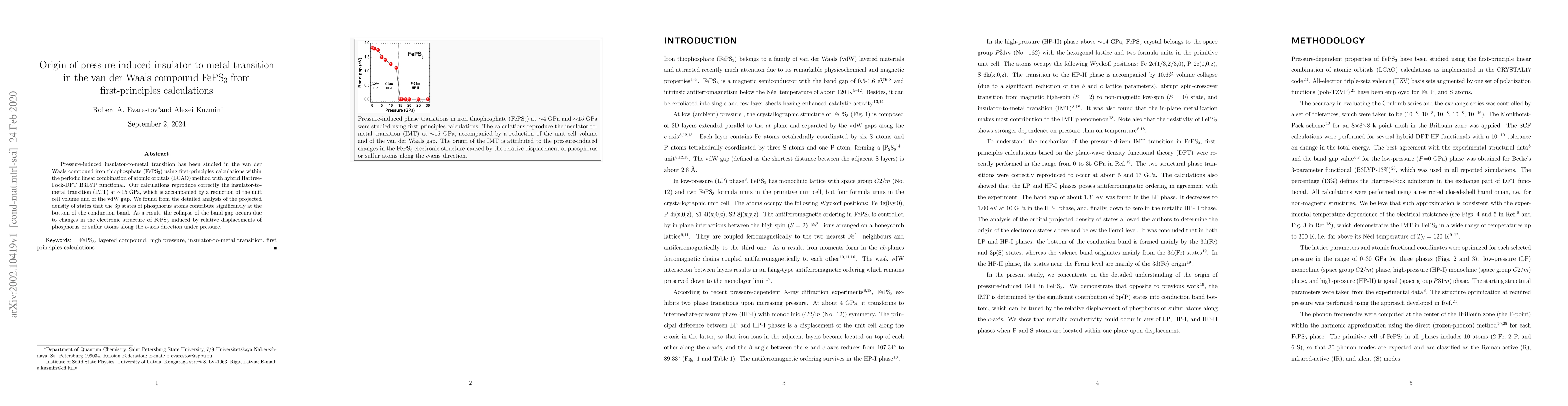 Summary: First-principles calculations reveal that FePS3 undergoes an insulator-to-metal transition at ~15 GPa, driven by a reduction in unit cell volume and collapse of the van der Waals gap. The transition is attributed to significant contributions from the 3p states of phosphorus atoms at the conduction band's bottom, resulting from electronic structure changes due to atomic displacements under pressure.