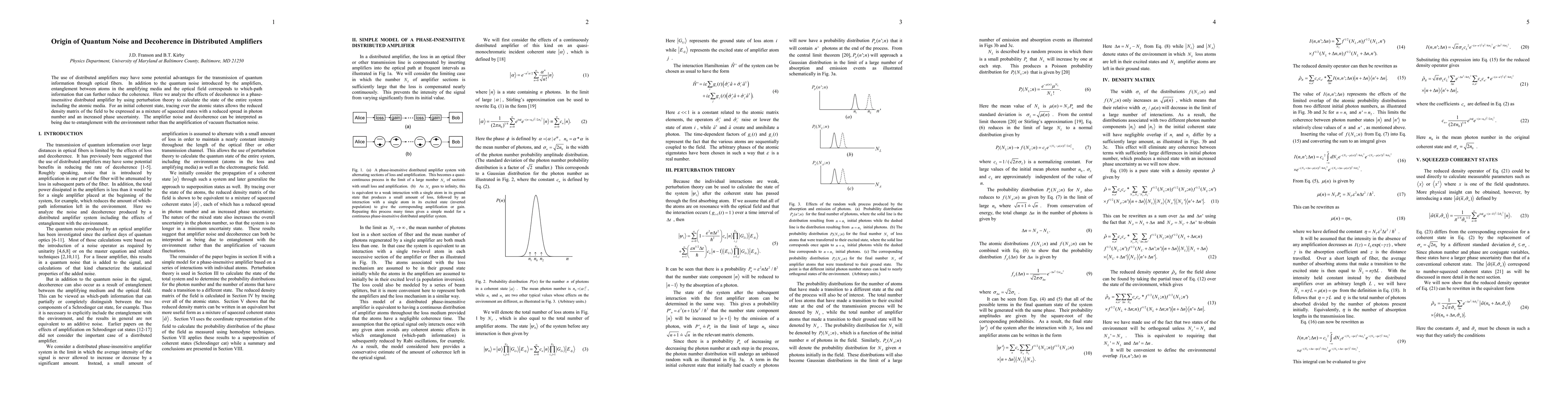 This paper investigates the quantum noise and decoherence in phase-insensitive distributed amplifiers used for quantum information transmission. It finds that decoherence arises from entanglement with the amplifying medium rather than vacuum fluctuation amplification, leading to a mixture of squeezed states with reduced photon number spread and increased phase uncertainty.