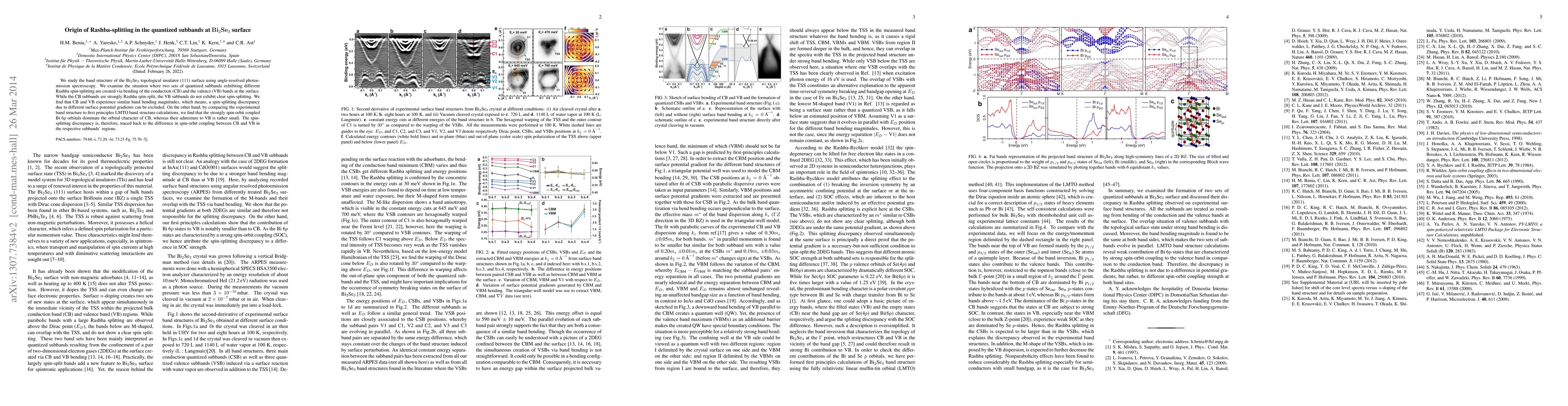 The research investigates the Bi2Se3 topological insulator's surface band structure using angle-resolved photoemission spectroscopy. It reveals that conduction band subbands are strongly Rashba spin-split, while valence band subbands lack clear spin-splitting, despite similar band bending. The study attributes this discrepancy to differing spin-orbit coupling strengths in conduction and valence bands.