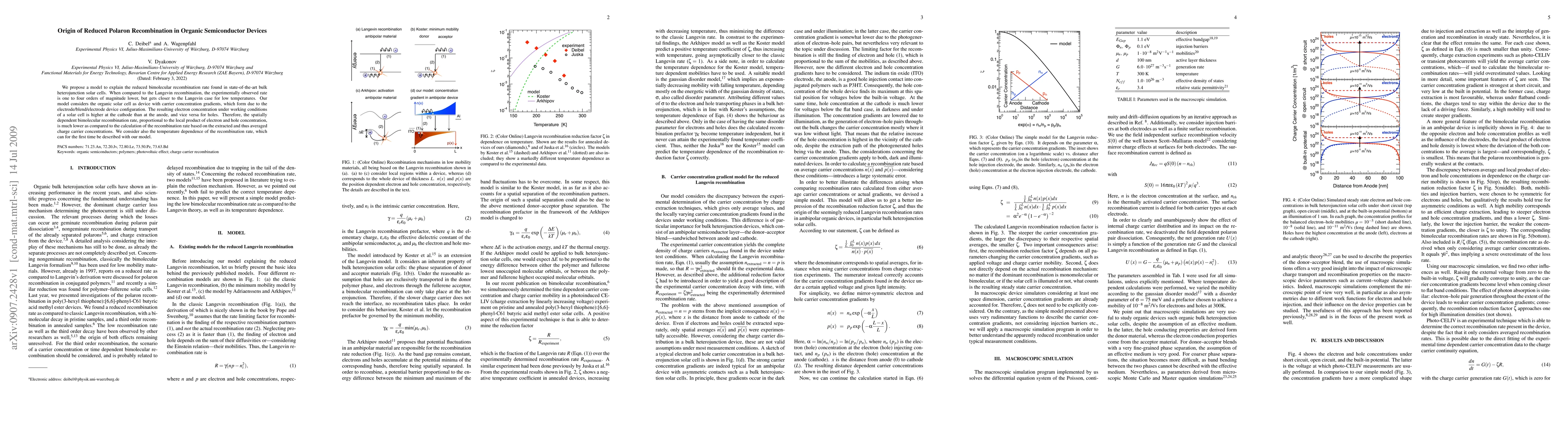 This paper proposes a model to explain the reduced bimolecular recombination rate in organic solar cells, attributing it to carrier concentration gradients due to the device's configuration, which lowers the recombination rate compared to averaged concentrations. The model also accounts for temperature dependence, showing that the recombination rate aligns more closely with the Langevin recombination at lower temperatures.