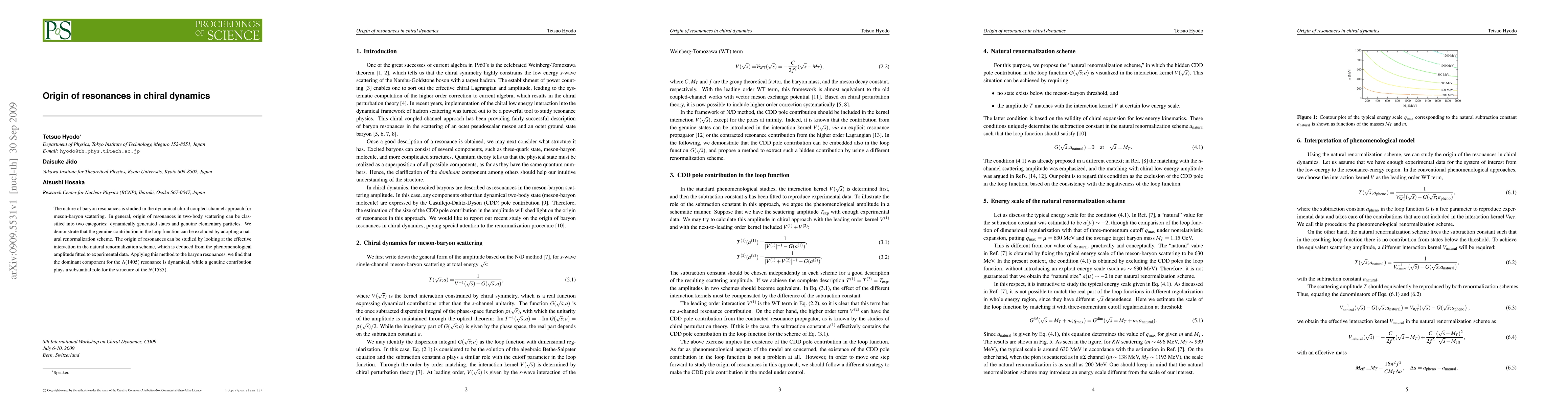 The nature of baryon resonances is studied in the dynamical chiral coupled-channel approach for meson-baryon scattering. In general, origin of resonances in two-body scattering can be classified into two categories: dynamically generated states and genuine elementary particles. We demonstrate that the genuine contribution in the loop function can be excluded by adopting a natural renormalization scheme. The origin of resonances can be studied by looking at the effective interaction in the natural renormalization scheme, which is deduced from the phenomenological amplitude fitted to experimental data. Applying this method to the baryon resonances, we find that the dominant component for the Lambda(1405) resonance is dynamical, while a genuine contribution plays a substantial role for the structure of the N(1535).