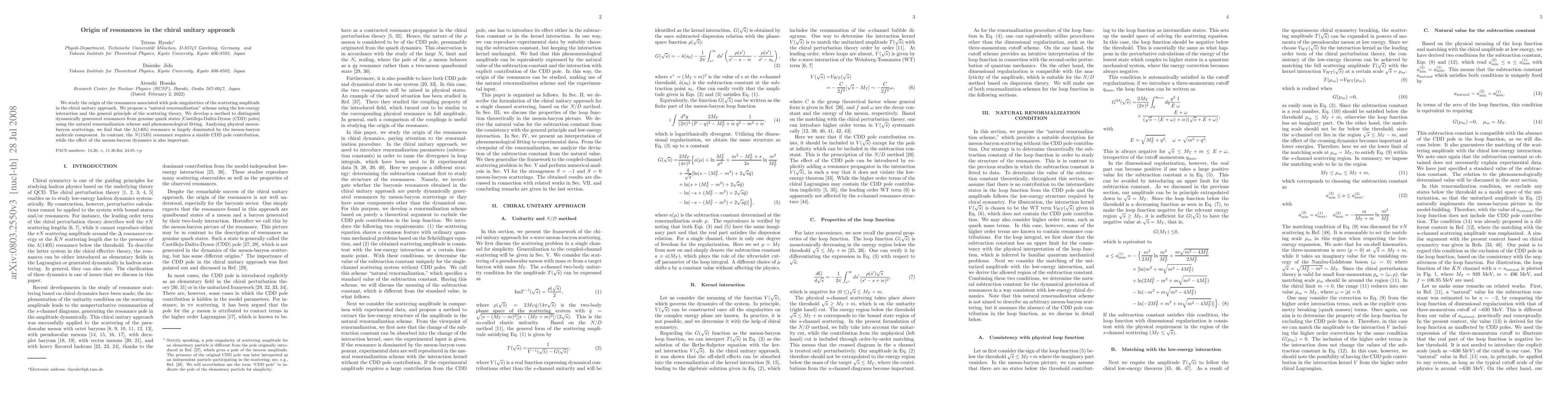 This paper investigates the origin of resonances in the chiral unitary approach, proposing a "natural renormalization" scheme to differentiate between dynamically generated resonances and genuine quark states. It finds that the Lambda(1405) resonance is primarily from meson-baryon interactions, while the N(1535) resonance involves both meson-baryon dynamics and a significant CDD pole contribution.