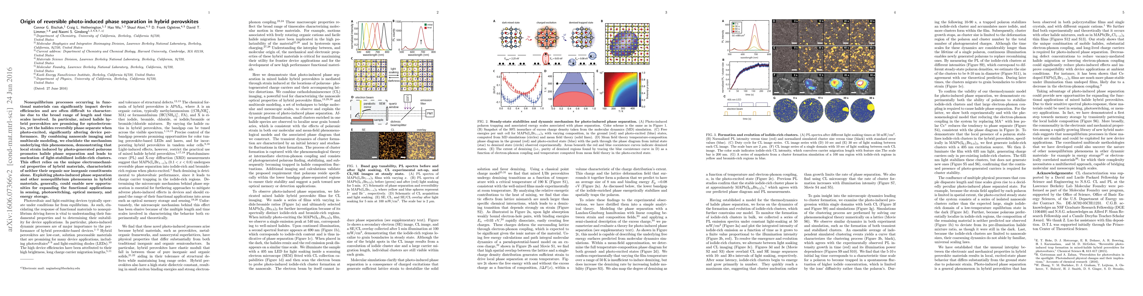 This research elucidates the mechanism of reversible photo-induced phase separation in hybrid perovskites, attributing it to local strain from photo-generated polarons leading to iodide-rich cluster formation. The study combines nanoscale imaging and modeling, revealing unique electromechanical properties in hybrid materials, suggesting potential for new applications in optoelectronics.