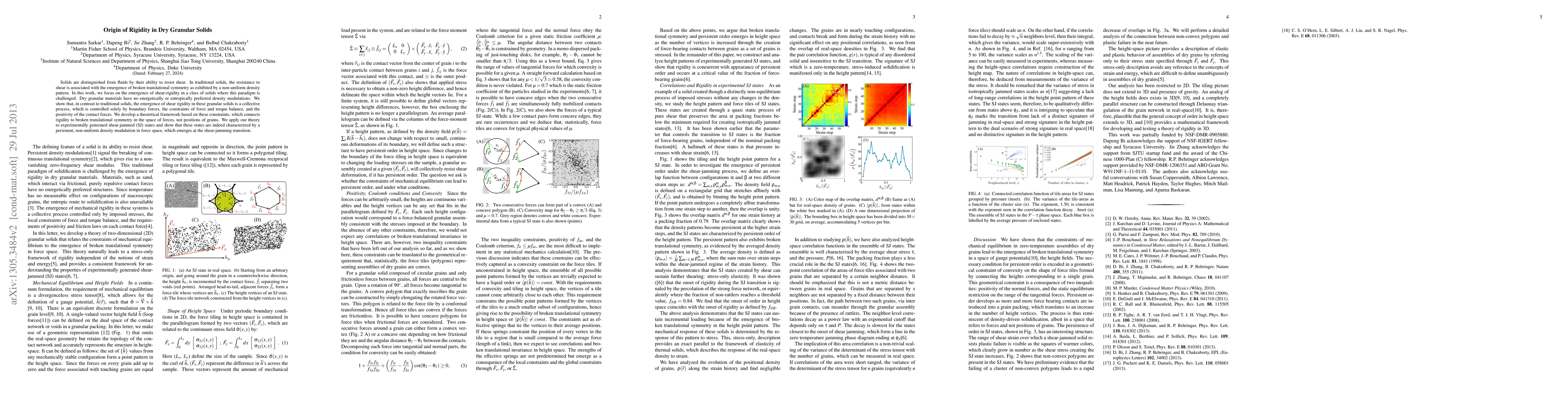 This paper explores the origin of shear rigidity in dry granular solids, demonstrating that it arises from a collective process governed by boundary forces and force balance constraints rather than density modulations. The theoretical framework developed connects rigidity to broken translational symmetry in the force space, revealing persistent, non-uniform density modulations at the shear-jamming transition.
