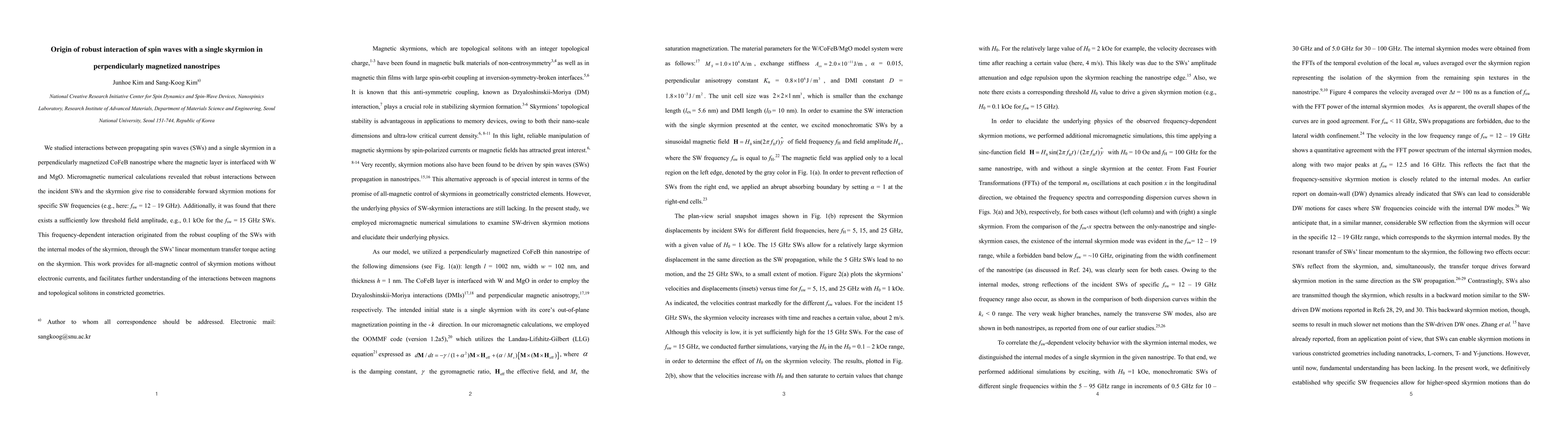 We studied interactions between propagating spin waves (SWs) and a single skyrmion in a perpendicularly magnetized CoFeB nanostripe where the magnetic layer is interfaced with W and MgO. Micromagnetic numerical calculations revealed that robust interactions between the incident SWs and the skyrmion give rise to considerable forward skyrmion motions for specific SW frequencies (e.g., here: fsw = 12 - 19 GHz). Additionally, it was found that there exists a sufficiently low threshold field amplitude, e.g., 0.1 kOe for the fsw = 15 GHz SWs. This frequency-dependent interaction originated from the robust coupling of the SWs with the internal modes of the skyrmion, through the SWs' linear momentum transfer torque acting on the skyrmion. This work provides for all-magnetic control of skyrmion motions without electronic currents, and facilitates further understanding of the interactions between magnons and topological solitons in constricted geometries.