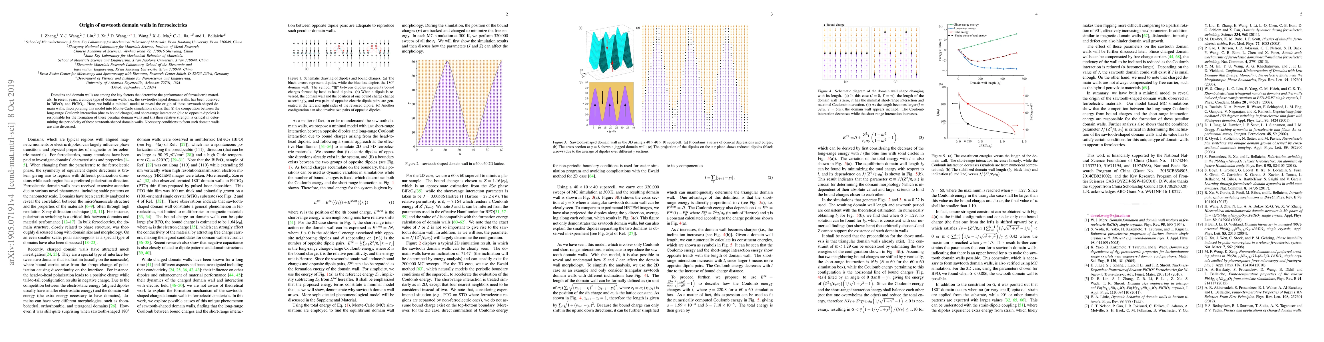 Domains and domain walls are among the key factors that determine the performance of ferroelectric materials. In recent years, a unique type of domain walls, i.e., the sawtooth-shaped domain walls, has been observed in BiFeO$_{3}$ and PbTiO$_{3}$. Here, we build a minimal model to reveal the origin of these sawtooth-shaped domain walls. Incorporating this model into Monte-Carlo simulations shows that (i) the competition between the long-range Coulomb interaction (due to bound charges) and short-range interaction (due to opposite dipoles) is responsible for the formation of these peculiar domain walls and (ii) their relative strength is critical in determining the periodicity of these sawtooth-shaped domain walls. Necessary conditions to form such domain walls are also discussed.