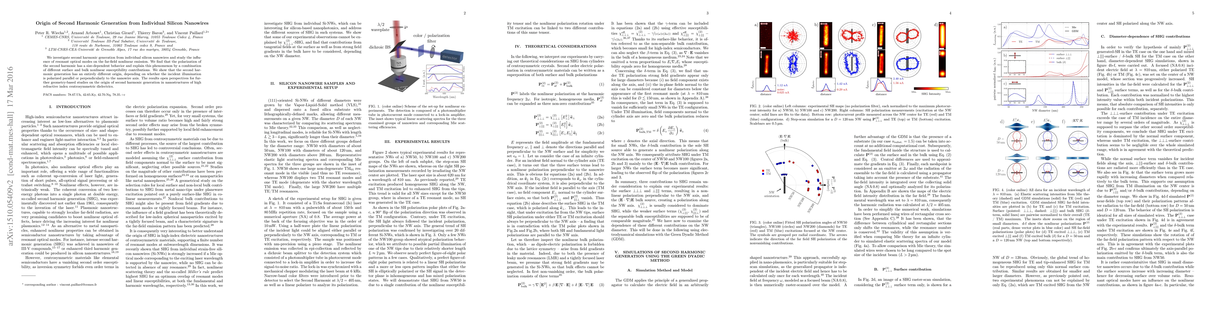 This study explores Second Harmonic Generation (SHG) in individual silicon nanowires, revealing size-dependent polarization influenced by surface and bulk nonlinear susceptibilities. The origin of SHG varies with the polarization of incident light relative to the nanowire axis, suggesting potential for advanced studies on SHG in nanostructured semiconductors.