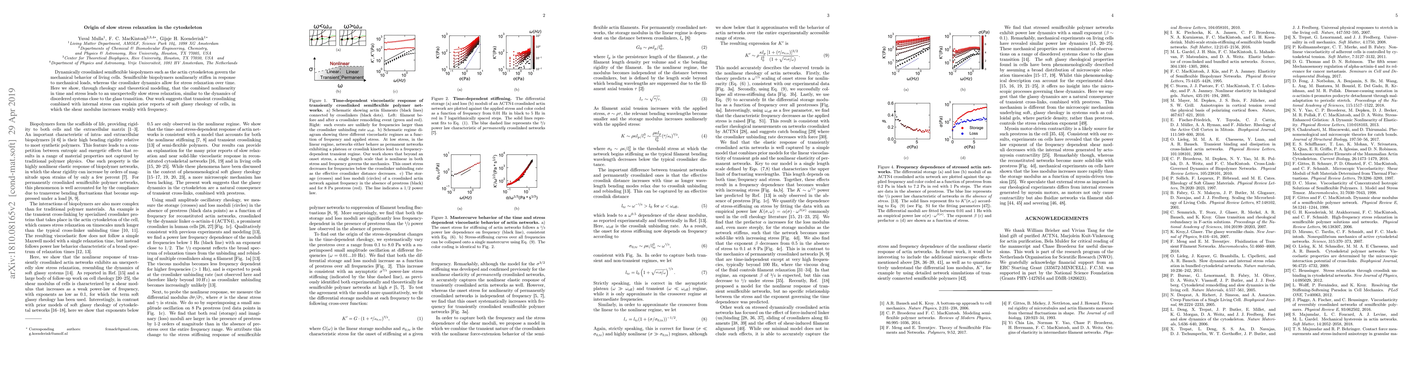 Dynamically crosslinked semiflexible biopolymers such as the actin cytoskeleton govern the mechanical behavior of living cells. Semiflexible biopolymers nonlinearly stiffen in response to mechanical loads, whereas the crosslinker dynamics allow for stress relaxation over time. Here we show, through rheology and theoretical modeling, that the combined nonlinearity in time and stress leads to an unexpectedly slow stress relaxation, similar to the dynamics of disordered systems close to the glass transition. Our work suggests that transient crosslinking combined with internal stress can explain prior reports of soft glassy rheology of cells, in which the shear modulus increases weakly with frequency.