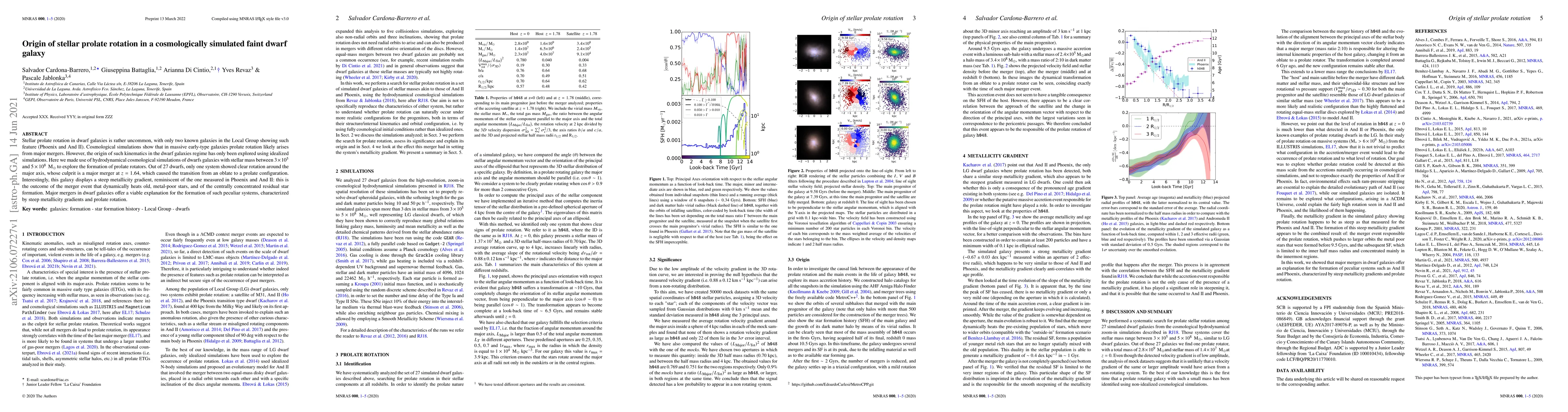 Stellar prolate rotation in dwarf galaxies is rather uncommon, with only two known galaxies in the Local Group showing such feature (Phoenix and And II). Cosmological simulations show that in massive early-type galaxies prolate rotation likely arises from major mergers. However, the origin of such kinematics in the dwarf galaxies regime has only been explored using idealized simulations. Here we made use of hydrodynamical cosmological simulations of dwarfs galaxies with stellar mass between $3\times10^5$ and $5\times10^8$ M$_{\odot}$ to explore the formation of prolate rotators. Out of $27$ dwarfs, only one system showed clear rotation around the major axis, whose culprit is a major merger at $z=1.64$, which caused the transition from an oblate to a prolate configuration. Interestingly, this galaxy displays a steep metallicity gradient, reminiscent of the one measured in Phoenix and And II: this is the outcome of the merger event that dynamically heats old, metal-poor stars, and of the centrally concentrated residual star formation. Major mergers in dwarf galaxies offer a viable explanation for the formation of such peculiar systems, characterized by steep metallicity gradients and prolate rotation.