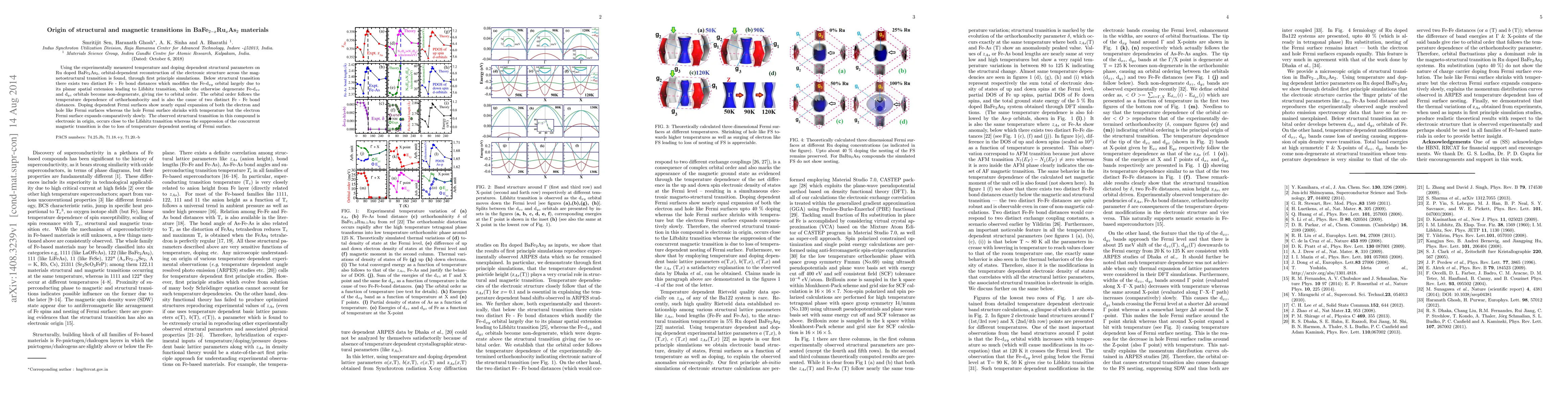 Using the experimentally measured temperature and doping dependent structural parameters on Ru doped BaFe$_2$As$_2$, orbital-dependent reconstruction of the electronic structure across the magnetostructural transition is found, through first principle simulations. Below structural transition there exists two distinct Fe - Fe bond distances which modifies the Fe-d$_{xy}$ orbital largely due to its planar spatial extension leading to Lifshitz transition, while the otherwise degenerate Fe-d$_{xz}$ and d$_{yz}$ orbitals become non-degenerate, giving rise to orbital order. The orbital order follows the temperature dependence of orthorhombocity and is also the cause of two distinct Fe - Fe bond distances. Doping dependent Fermi surfaces show nearly equal expansion of both the electron and hole like Fermi surfaces whereas the hole Fermi surface shrinks with temperature but the electron Fermi surface expands comparatively slowly. The observed structural transition in this compound is electronic in origin, occurs close to the Lifshitz transition whereas the suppression of the concurrent magnetic transition is due to loss of temperature dependent nesting of Fermi surface.
