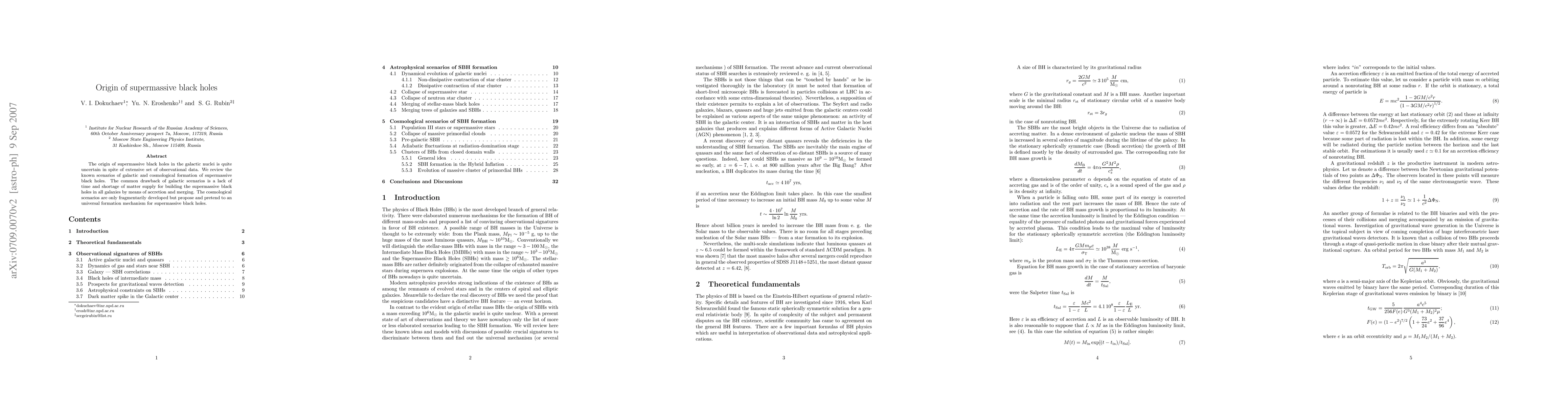 The origin of supermassive black holes in the galactic nuclei is quite uncertain in spite of extensive set of observational data. We review the known scenarios of galactic and cosmological formation of supermassive black holes. The common drawback of galactic scenarios is a lack of time and shortage of matter supply for building the supermassive black holes in all galaxies by means of accretion and merging. The cosmological scenarios are only fragmentarily developed but propose and pretend to an universal formation mechanism for supermassive black holes.