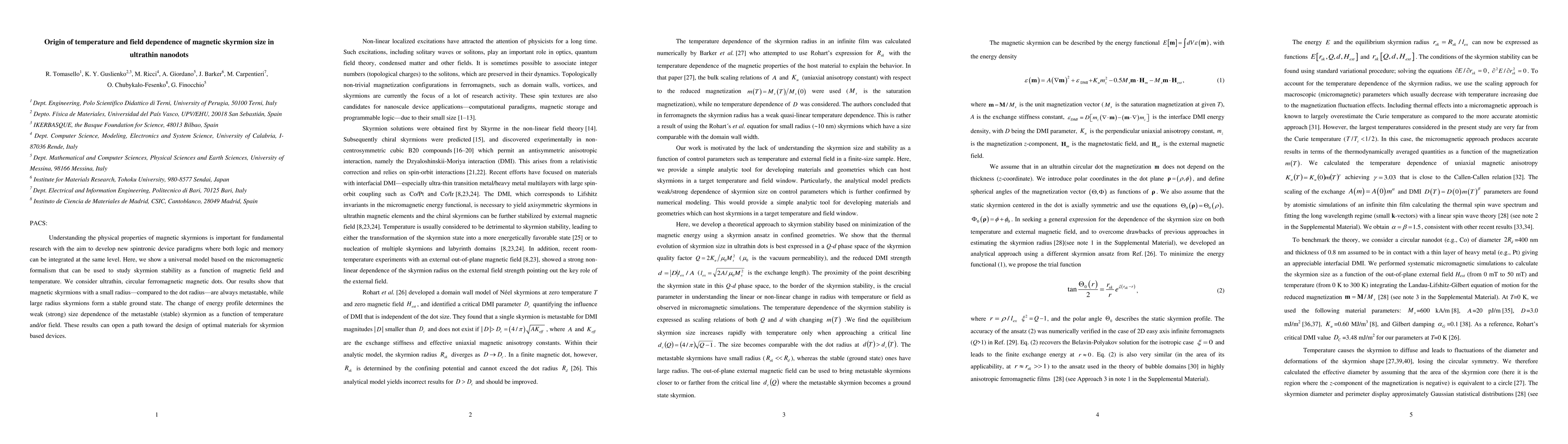 This paper presents a universal micromagnetic model to study magnetic skyrmion stability in ultrathin ferromagnetic nanodots, revealing that small skyrmion radii are metastable while large radii are stable, influencing size dependence on temperature and field. This insight aids in designing materials for advanced spintronic devices.