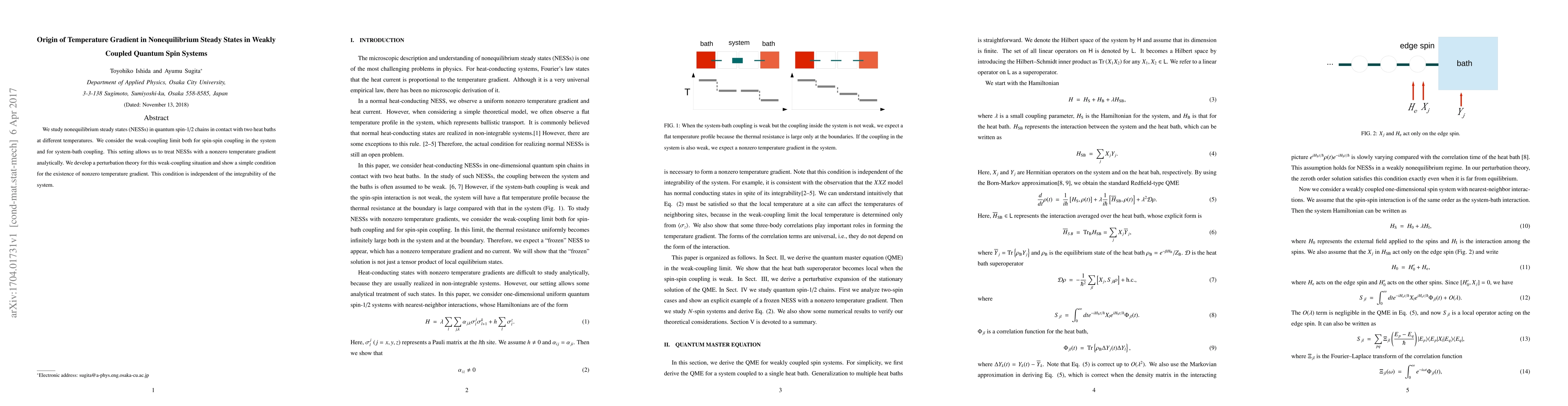 This paper explores nonequilibrium steady states in weakly coupled quantum spin-1/2 chains connected to different temperature heat baths. It develops a perturbation theory to analytically treat the nonzero temperature gradient, revealing a condition for its existence that is independent of the system's integrability.