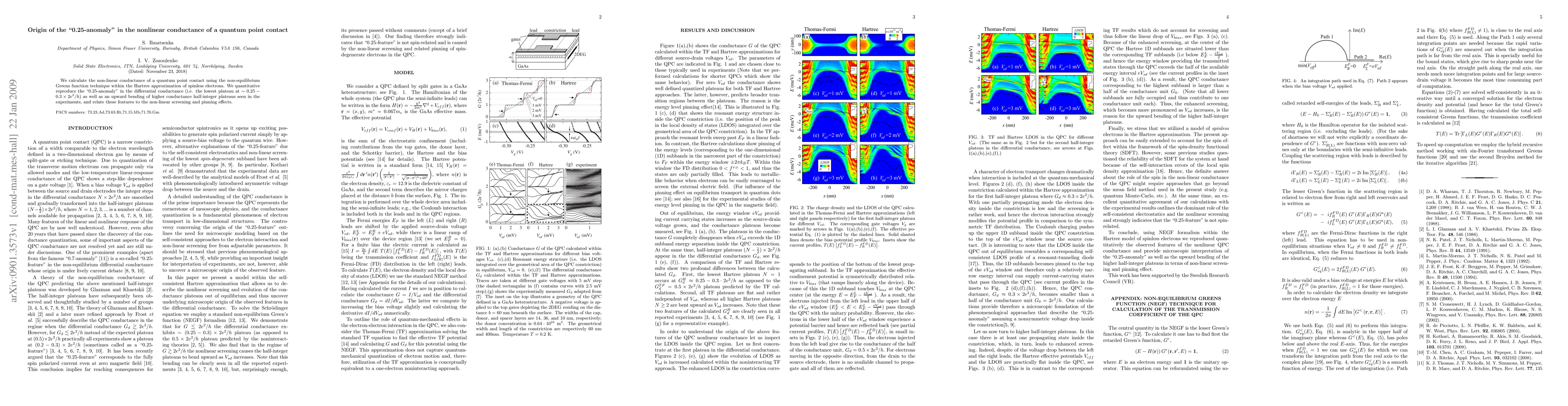 We calculate the non-linear conductance of a quantum point contact using the non-equilibrium Greens function technique within the Hartree approximation of spinless electrons. We quantitative reproduce the 0.25-anomaly in the differential conductance (i.e. the lowest plateau at 0.25-0.3*2e^2/h) as well as an upward bending of higher conductance half-integer plateaus seen in the experiments, and relate these features to the non-linear screening and pinning effects.