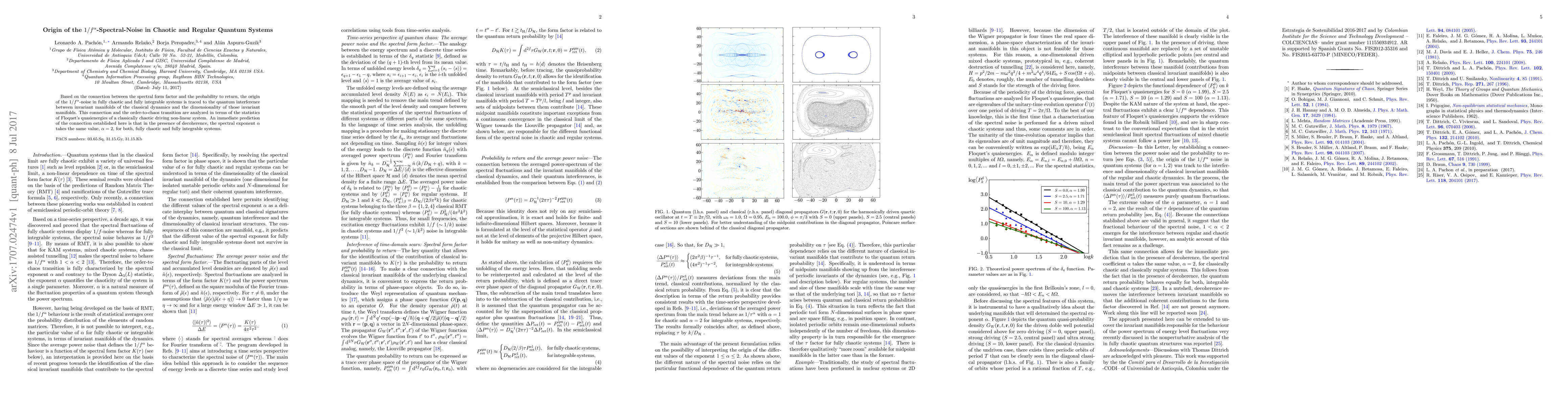 Based on the connection between the spectral form factor and the probability to return, the origin of the $1/f^\alpha$-noise in fully chaotic and fully integrable systems is traced to the quantum interference between invariant manifolds of the classical dynamics and the dimensionality of those invariant manifolds. This connection and the order-to-chaos transition are analyzed in terms of the statistics of Floquet's quasienergies of a classically chaotic driving non-linear system. An immediate prediction of the connection established here is that in the presence of decoherence, the spectral exponent $\alpha$ takes the same value, $\alpha=2$, for both, fully chaotic and fully integrable systems.