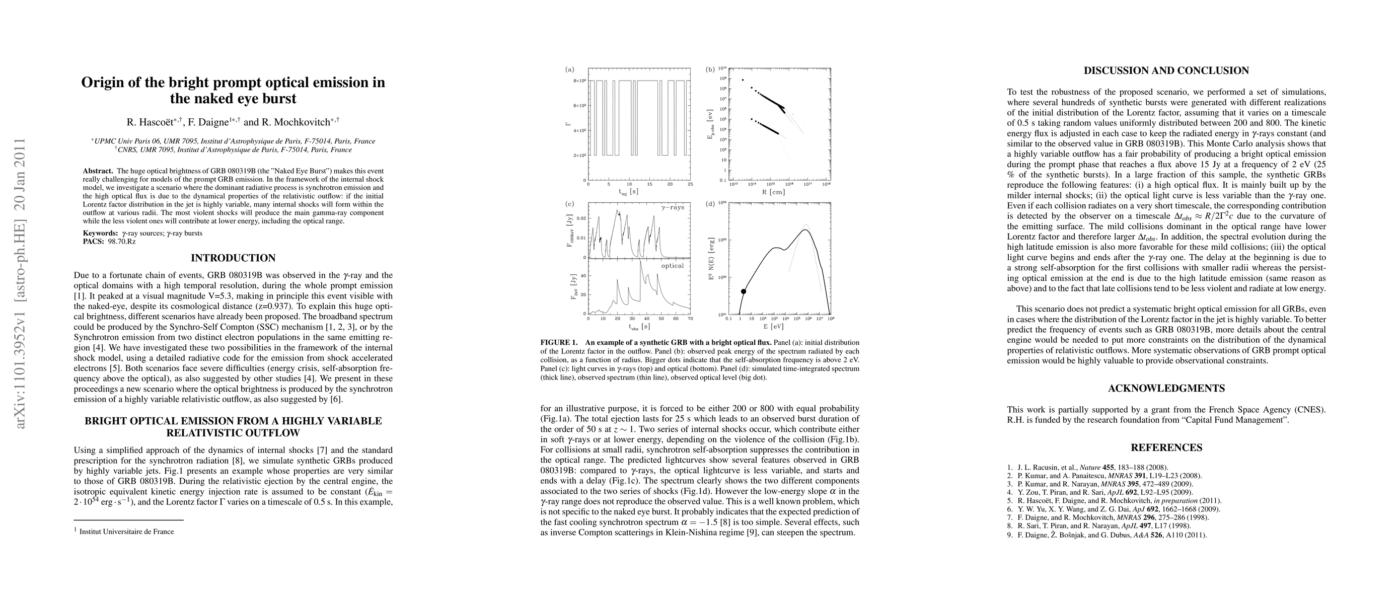 The huge optical brightness of GRB 080319B (the "Naked Eye Burst) makes this event really challenging for models of the prompt GRB emission. In the framework of the internal shock model, we investigate a scenario where the dominant radiative process is synchrotron emission and the high optical flux is due to the dynamical properties of the relativistic outflow: if the initial Lorentz factor distribution in the jet is highly variable, many internal shocks will form within the outflow at various radii. The most violent shocks will produce the main gamma-ray component while the less violent ones will contribute at lower energy, including the optical range.