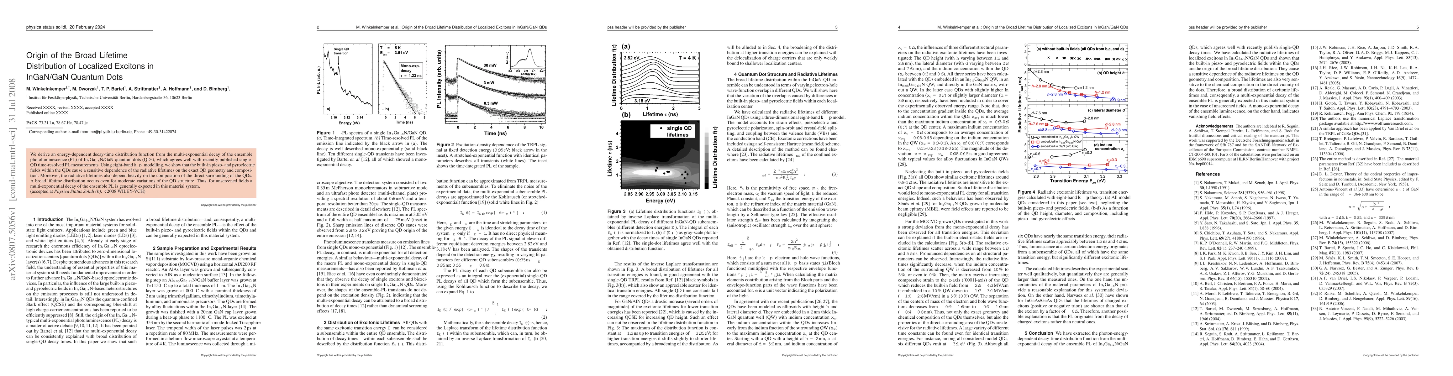 This paper investigates the broad lifetime distribution of localized excitons in InGaN/GaN quantum dots, attributing it to the influence of built-in piezo- and pyroelectric fields, which cause significant variations in radiative lifetimes based on quantum dot geometry and surrounding composition. The findings are supported by eight-band k.p modelling and align with single-QD time-resolved photoluminescence measurements.