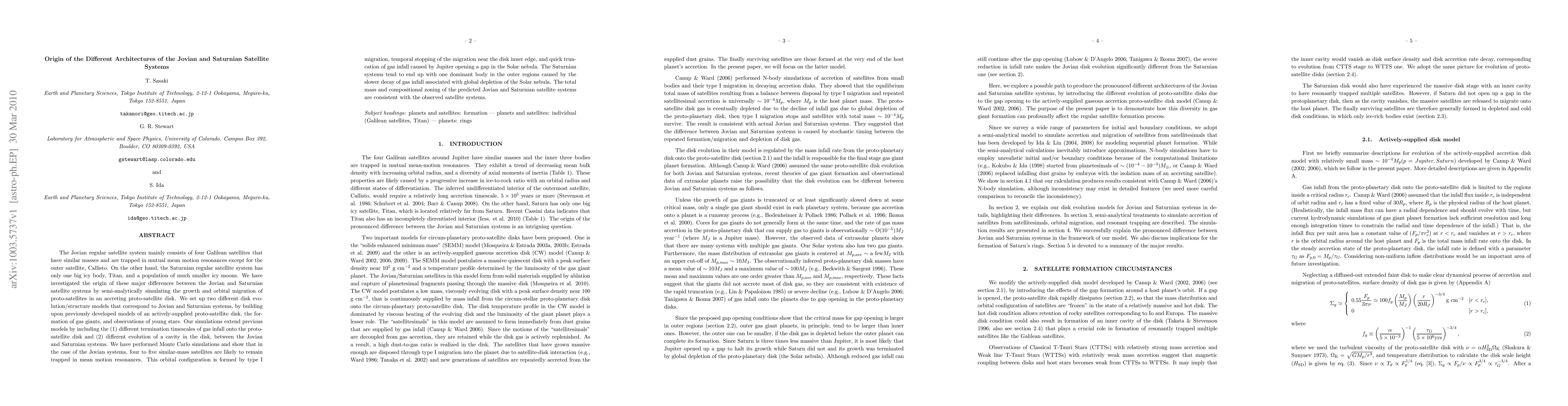 This paper explores the origins of the differing architectures of the Jovian and Saturnian satellite systems through semi-analytical simulations of proto-satellite disk formation and evolution. The study finds that the Jovian system's four to five similar-mass satellites in mean motion resonances result from type I migration and rapid gas infall truncation, while the Saturnian system's single dominant icy body arises from slower gas infall decay.