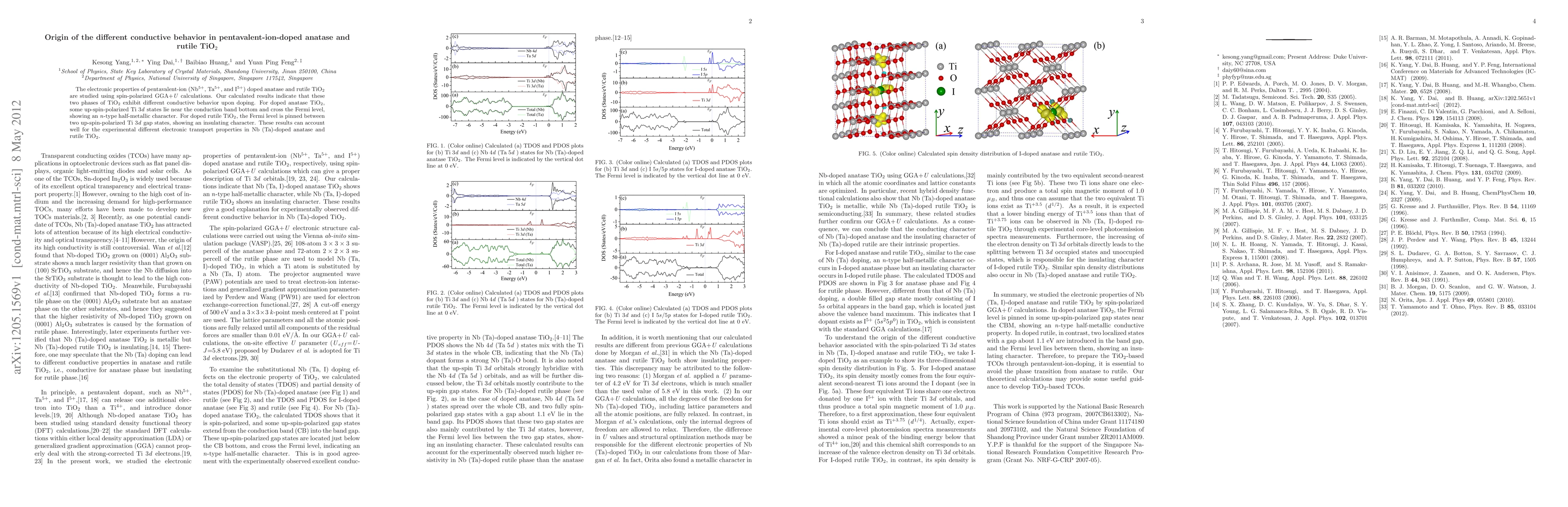 The study using spin-polarized GGA+U calculations reveals that pentavalent-ion doping in anatase and rutile TiO$_2$ results in different conductive behaviors: anatase shows n-type half-metallic character while rutile remains insulating due to Fermi level pinning between gap states.
