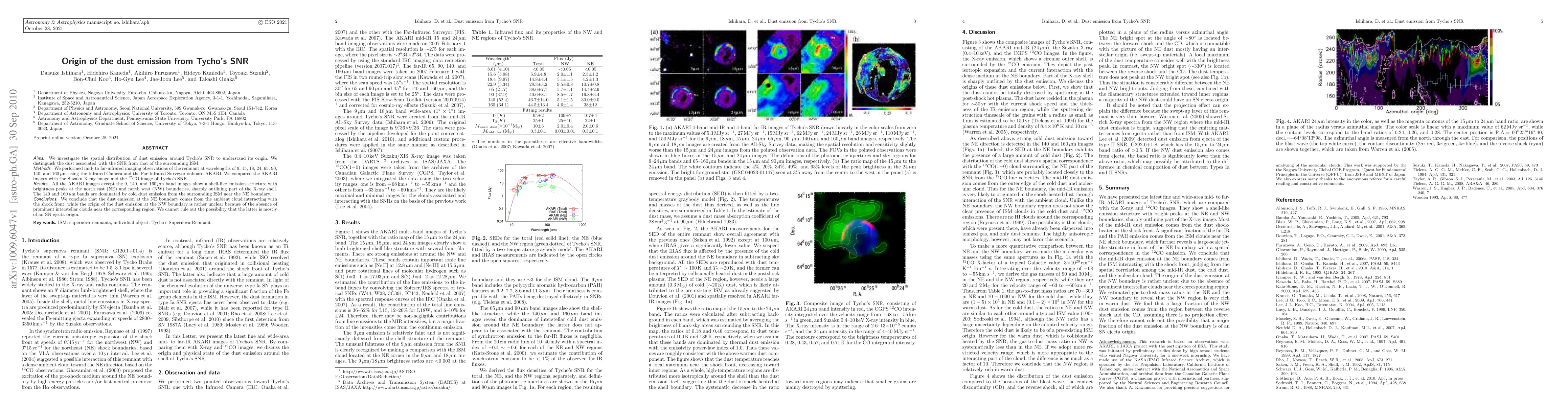 This study uses infrared imaging to investigate the dust emission around Tycho's SNR, revealing a shell-like structure with peaks at the northeast and northwest boundaries. The northeast boundary's dust likely originates from an ambient cloud interacting with the shock front, while the origin of the northwest boundary's dust remains ambiguous, possibly due to SN ejecta.