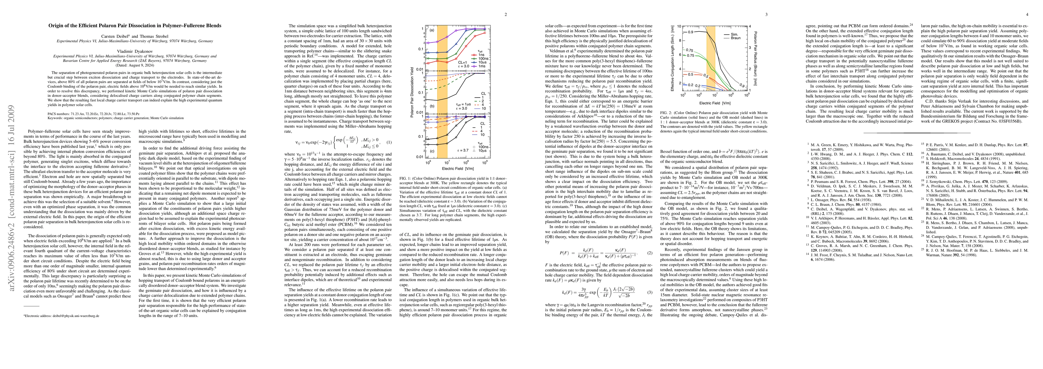 This paper investigates the efficient dissociation of photogenerated polaron pairs in polymer-fullerene blends used in organic solar cells, revealing that local charge carrier transport along conjugated polymer chains significantly enhances dissociation efficiency, explaining the high experimental quantum yields despite lower electric fields.