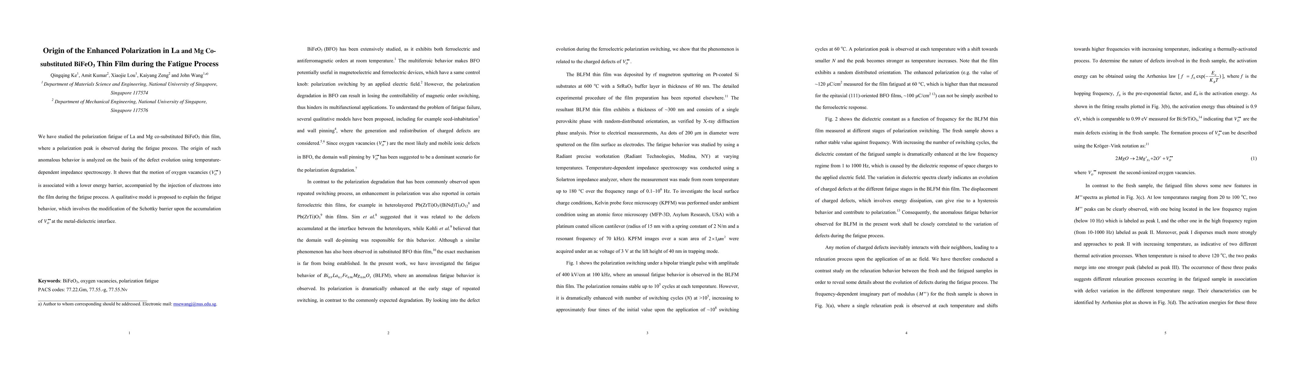 This paper investigates the polarization fatigue in La and Mg co-substituted BiFeO3 thin films, revealing a peak in polarization during fatigue. The study attributes this anomaly to the motion of oxygen vacancies with a lower energy barrier, leading to electron injection, and proposes a model involving modified Schottky barriers at the metal-dielectric interface.