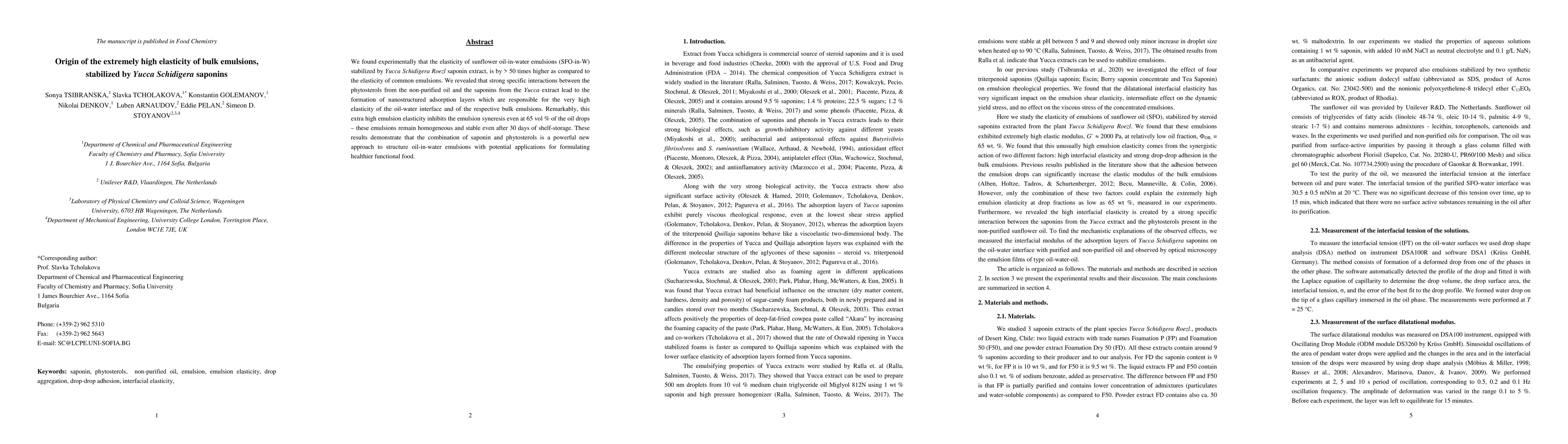 We found experimentally that the elasticity of sunflower oil-in-water emulsions (SFO-in-W) stabilized by Yucca Schidigera Roezl saponin extract, is by more than 50 times higher as compared to the elasticity of common emulsions. We revealed that strong specific interactions between the phytosterols from the non-purified oil and the saponins from the Yucca extract lead to the formation of nanostructured adsorption layers which are responsible for the very high elasticity of the oil-water interface and of the respective bulk emulsions. Remarkably, this extra high emulsion elasticity inhibits the emulsion syneresis even at 65 vol % of the oil drops. These emulsions remain homogeneous and stable even after 30 days of shelf-storage. These results demonstrate that the combination of saponin and phytosterols is a powerful new approach to structure oil-in-water emulsions with potential applications for formulating healthier functional food.