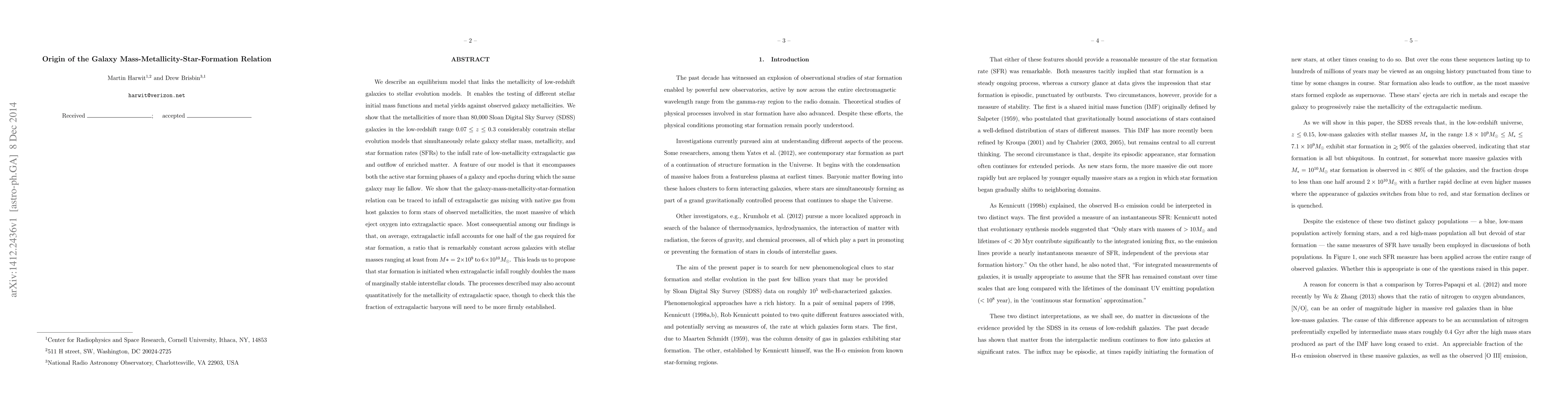 We describe an equilibrium model that links the metallicity of low-redshift galaxies to stellar evolution models. It enables the testing of different stellar initial mass functions and metal yields against observed galaxy metallicities. We show that the metallicities of more than 80,000 Sloan Digital Sky Survey (SDSS) galaxies in the low-redshift range $0.07\leq z\leq 0.3$ considerably constrain stellar evolution models that simultaneously relate galaxy stellar mass, metallicity, and star formation rates (SFRs) to the infall rate of low-metallicity extragalactic gas and outflow of enriched matter. A feature of our model is that it encompasses both the active star forming phases of a galaxy and epochs during which the same galaxy may lie fallow. We show that the galaxy-mass-metallicity-star-formation relation can be traced to infall of extragalactic gas mixing with native gas from host galaxies to form stars of observed metallicities, the most massive of which eject oxygen into extragalactic space. Most consequential among our findings is that, on average, extragalactic infall accounts for one half of the gas required for star formation, a ratio that is remarkably constant across galaxies with stellar masses ranging at least from $M* = 2 \times 10^9$ to $6\times 10^{10} M_{\odot}$. This leads us to propose that star formation is initiated when extragalactic infall roughly doubles the mass of marginally stable interstellar clouds. The processes described may also account quantitatively for the metallicity of extragalactic space, though to check this the fraction of extragalactic baryons will need to be more firmly established.