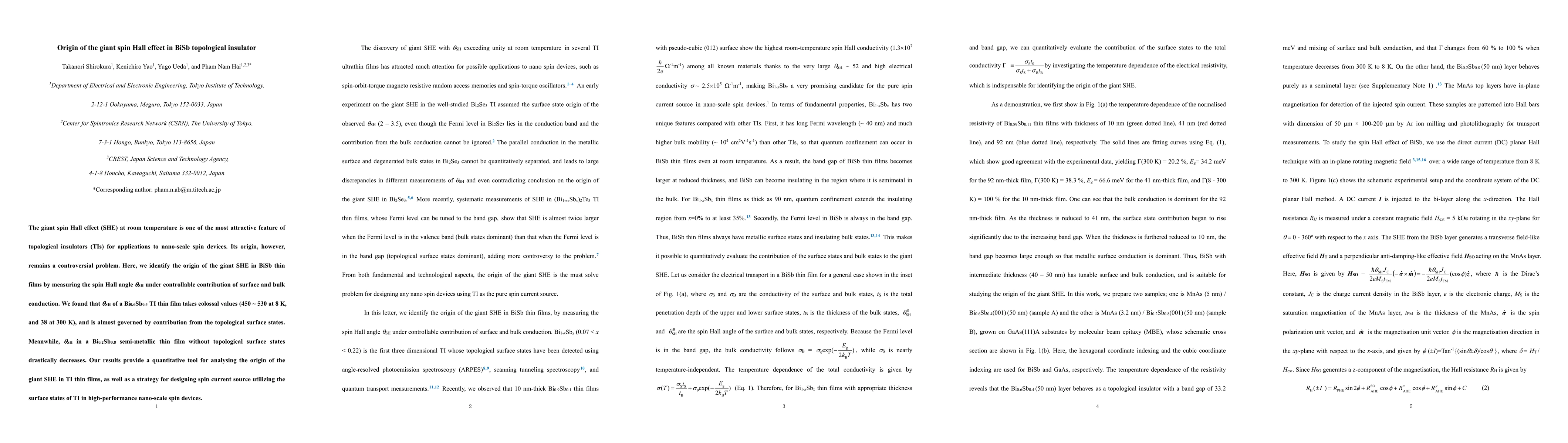 This paper identifies the origin of the giant spin Hall effect in BiSb topological insulator thin films, finding that the colossal spin Hall angle is primarily due to topological surface states, while semi-metallic films without these states show a significantly reduced effect. This provides insights into designing spin current sources for nano-scale spin devices.